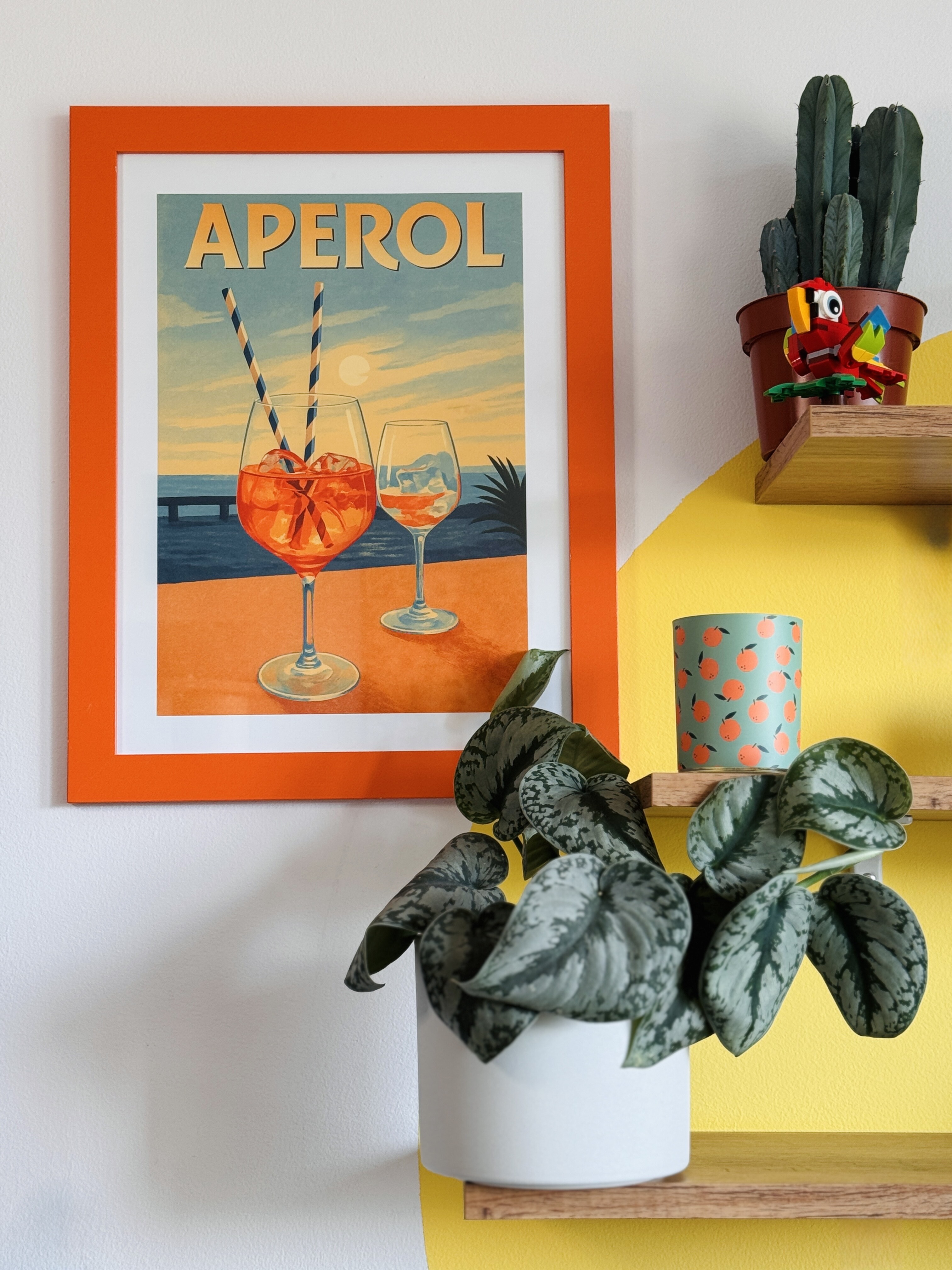 Plakat z grafiką popularnego drinka Aperol Spritz to idealna dekoracja, która wniesie do wnętrza nutę wakacyjnej lekkości i włoskiego klimatu. Wydrukowany został na wysokiej jakości papierze fotograficznym, co zapewnia trwałość i wyrazistość kolorów. Plakat oprawiony jest w drewnianą ramę z szybką ochronną, co chroni wydruk przed kurzem i uszkodzeniami mechanicznymi. Produkt sprzedawany jest w formie plakatu z ramą (zgodnie z prezentacją na zdjęciu). Rośliny i inne elementy widoczne w aranżacji nie wchodzą w skład zestawu.