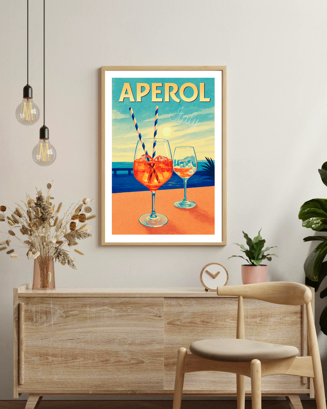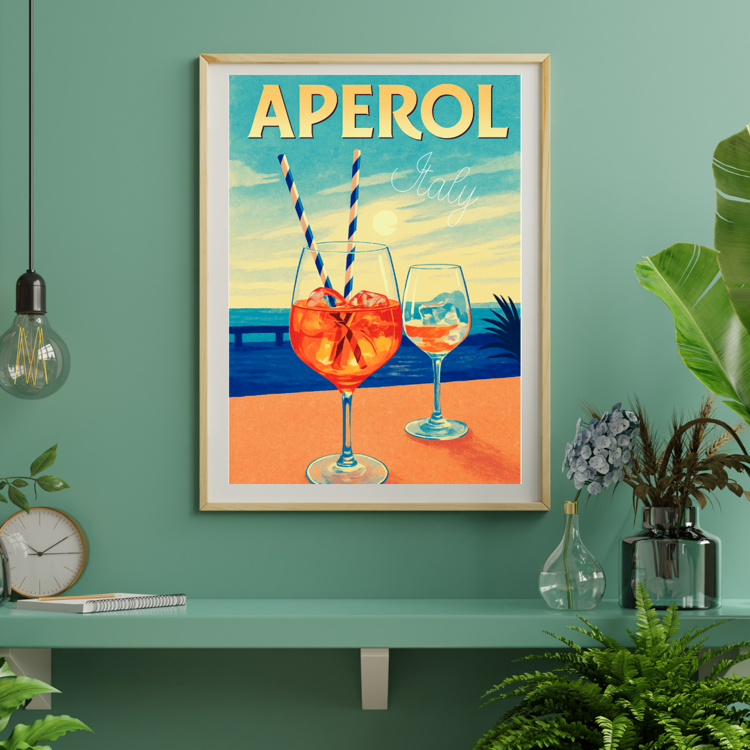 Plakat „Aperol Italy” to autorska grafika przedstawiająca dwa kieliszki Aperol Spritz na tle włoskiego wybrzeża o zachodzie słońca. Ciepłe pomarańcze przeplatają się z błękitem morza i pastelowym niebem, tworząc harmonijną, przyciągającą wzrok kompozycję.