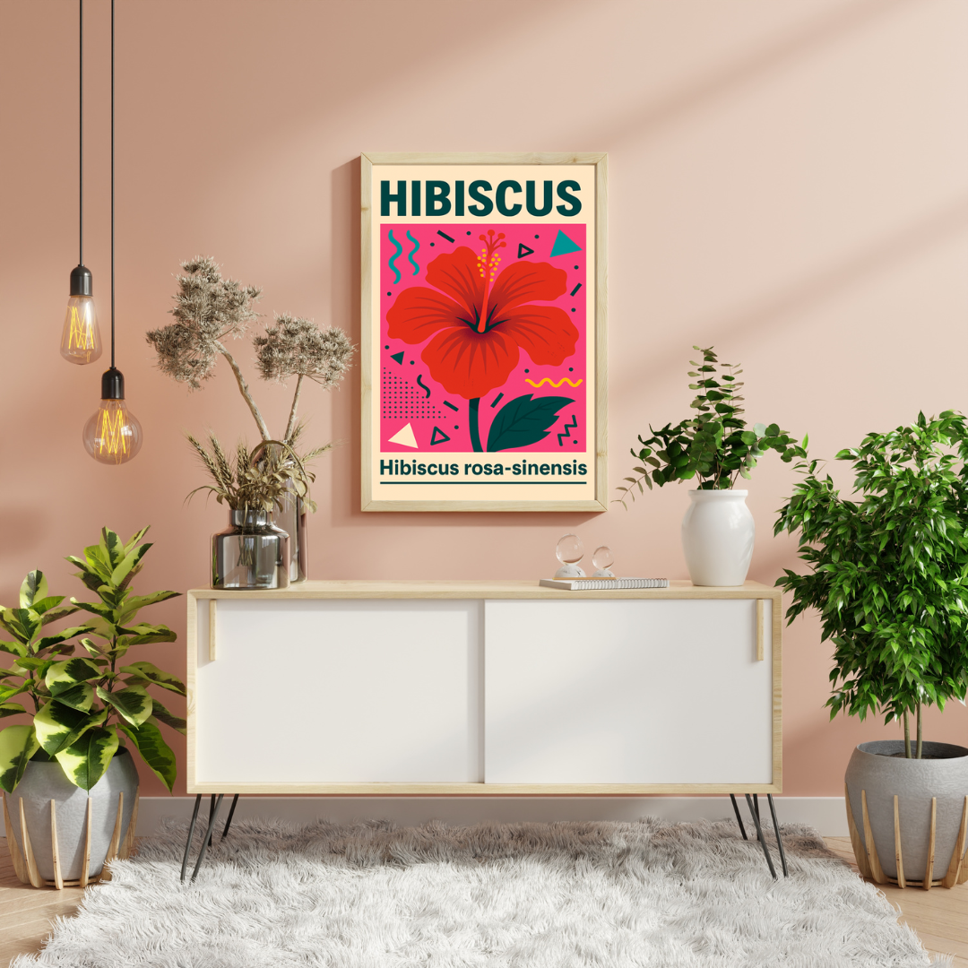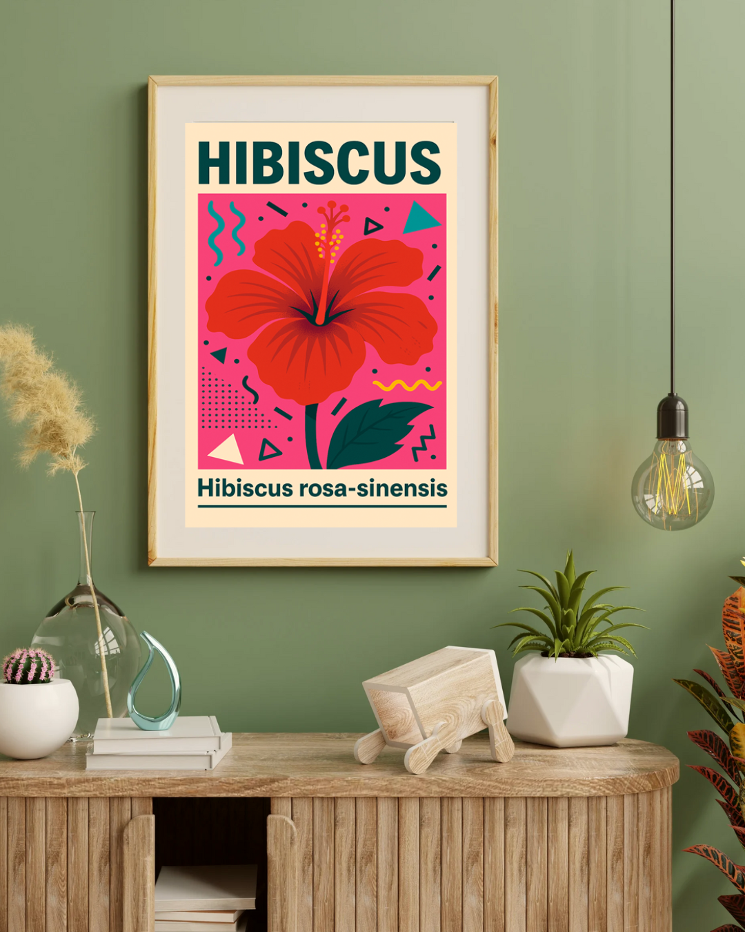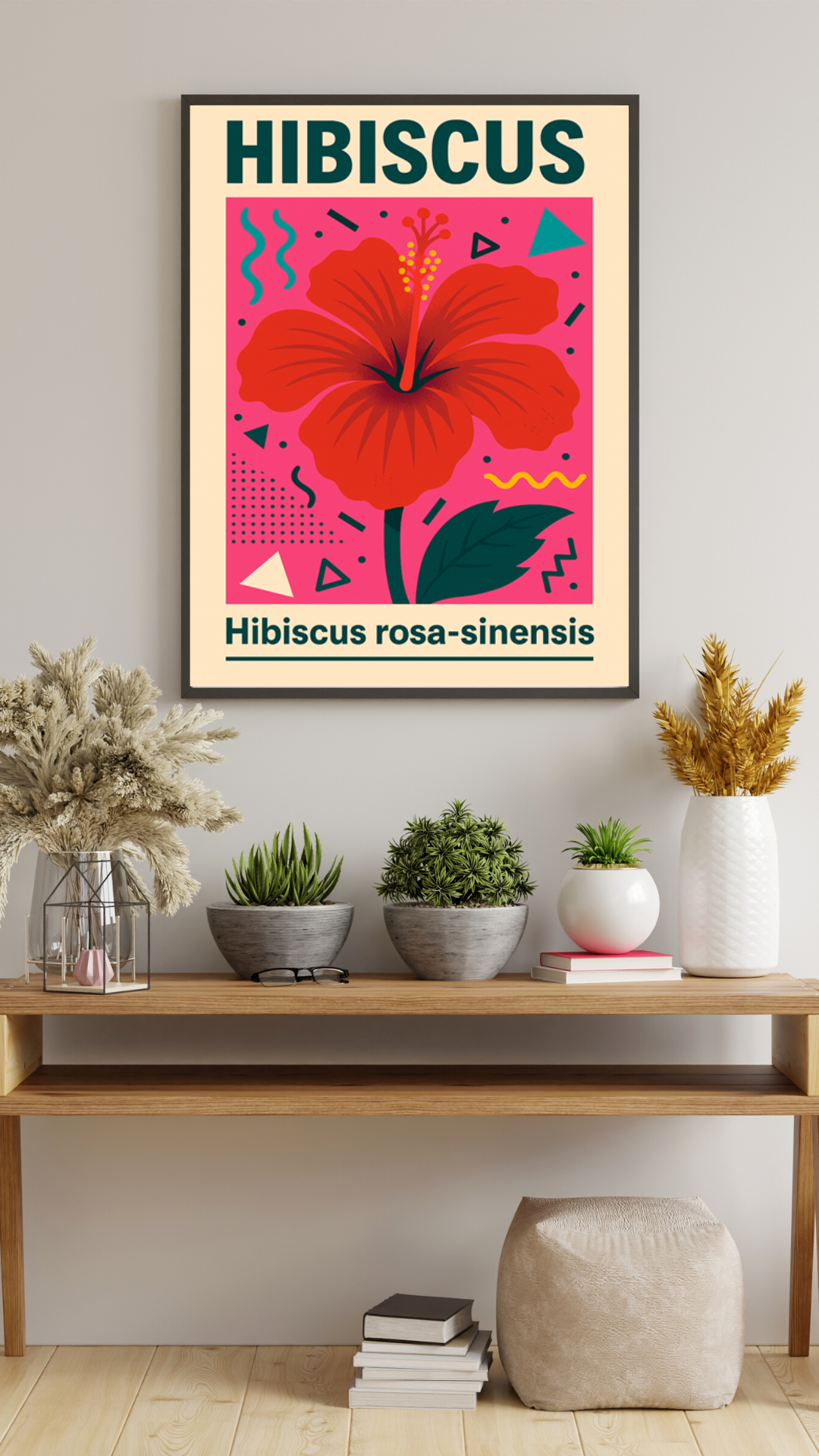 Plakat Hibiscus to nowoczesna interpretacja klasycznego motywu botanicznego, inspirowana estetyką urban jungle i współczesnym designem plakatowym. Centralnym elementem grafiki jest intensywnie czerwony hibiskus (Hibiscus rosa-sinensis), przedstawiony w uproszczonej, graficznej formie, która przyciąga wzrok i nadaje wnętrzu wyrazisty charakter.