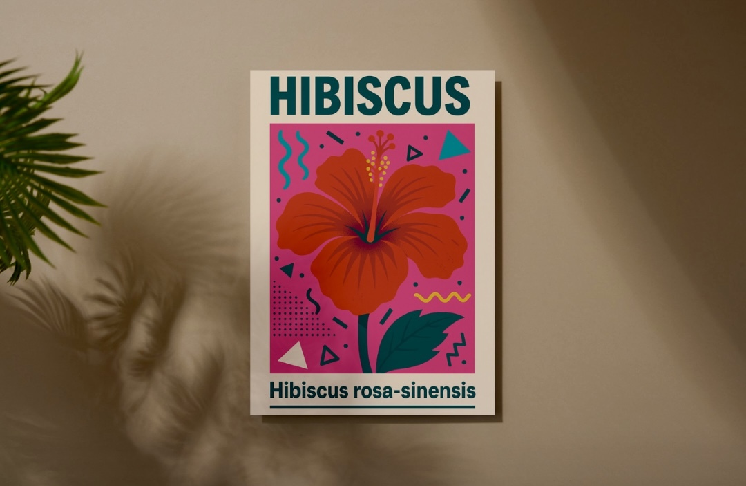 Plakat A3 z wizerunkiem Hibiscusa rosa-sinensis to efektowna dekoracja ścienna, która wniesie do wnętrza egzotyczny klimat i energię tropików. Intensywna czerwień kwiatu na tle wyrazistych geometrycznych wzorów przyciąga uwagę i nadaje pomieszczeniu wyjątkowego charakteru.