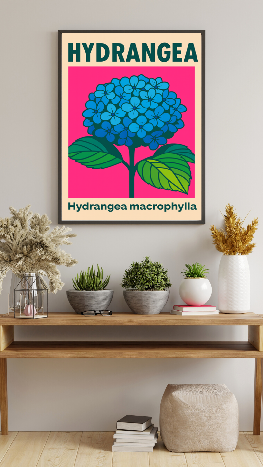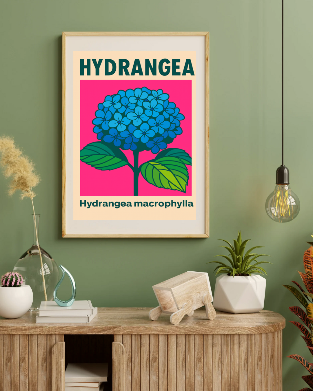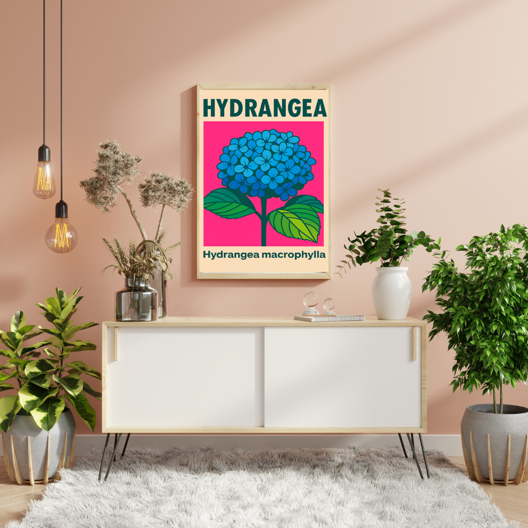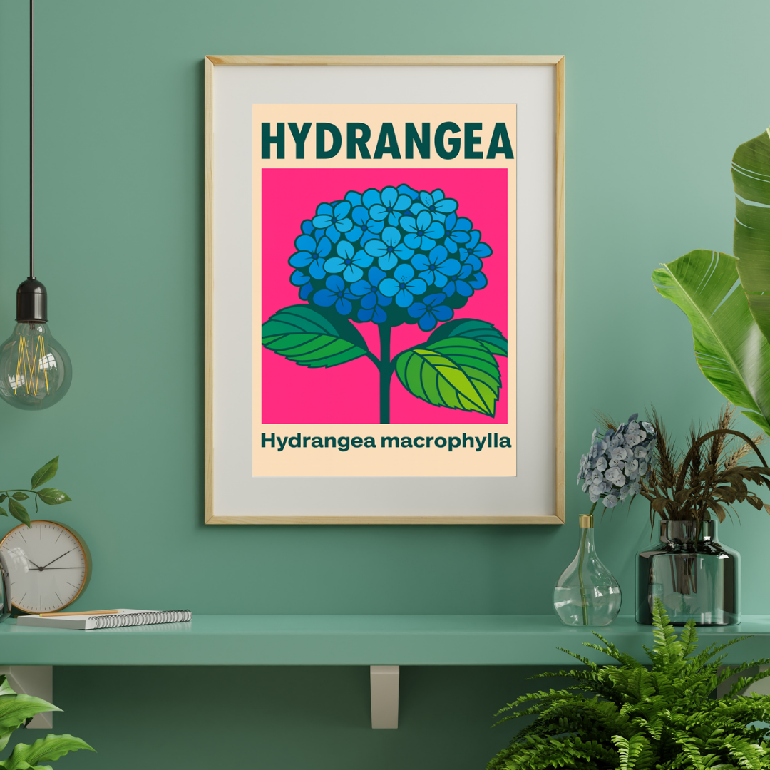 Plakat Hydrangea to współczesna interpretacja klasycznej ilustracji botanicznej, łącząca naturalny motyw roślinny z nowoczesnym, graficznym stylem. Centralnym elementem kompozycji jest okazały kwiat hortensji (Hydrangea macrophylla) w intensywnym odcieniu błękitu, osadzony na kontrastowym, energetycznym tle.