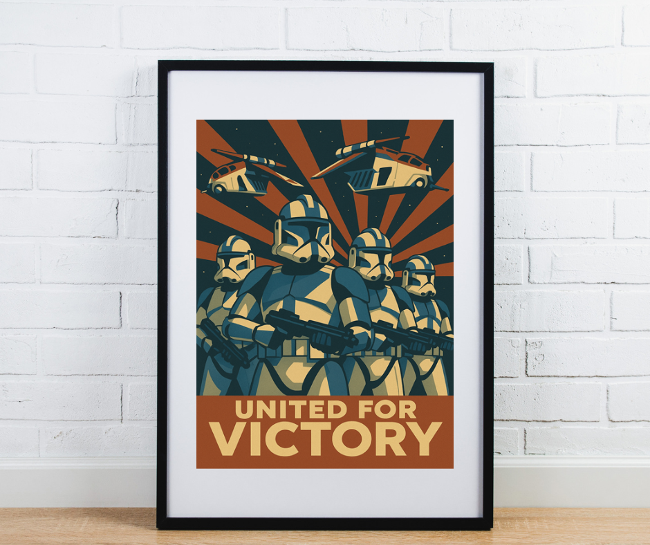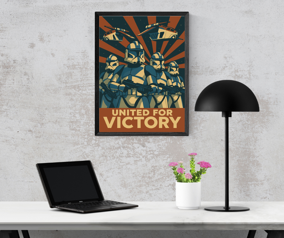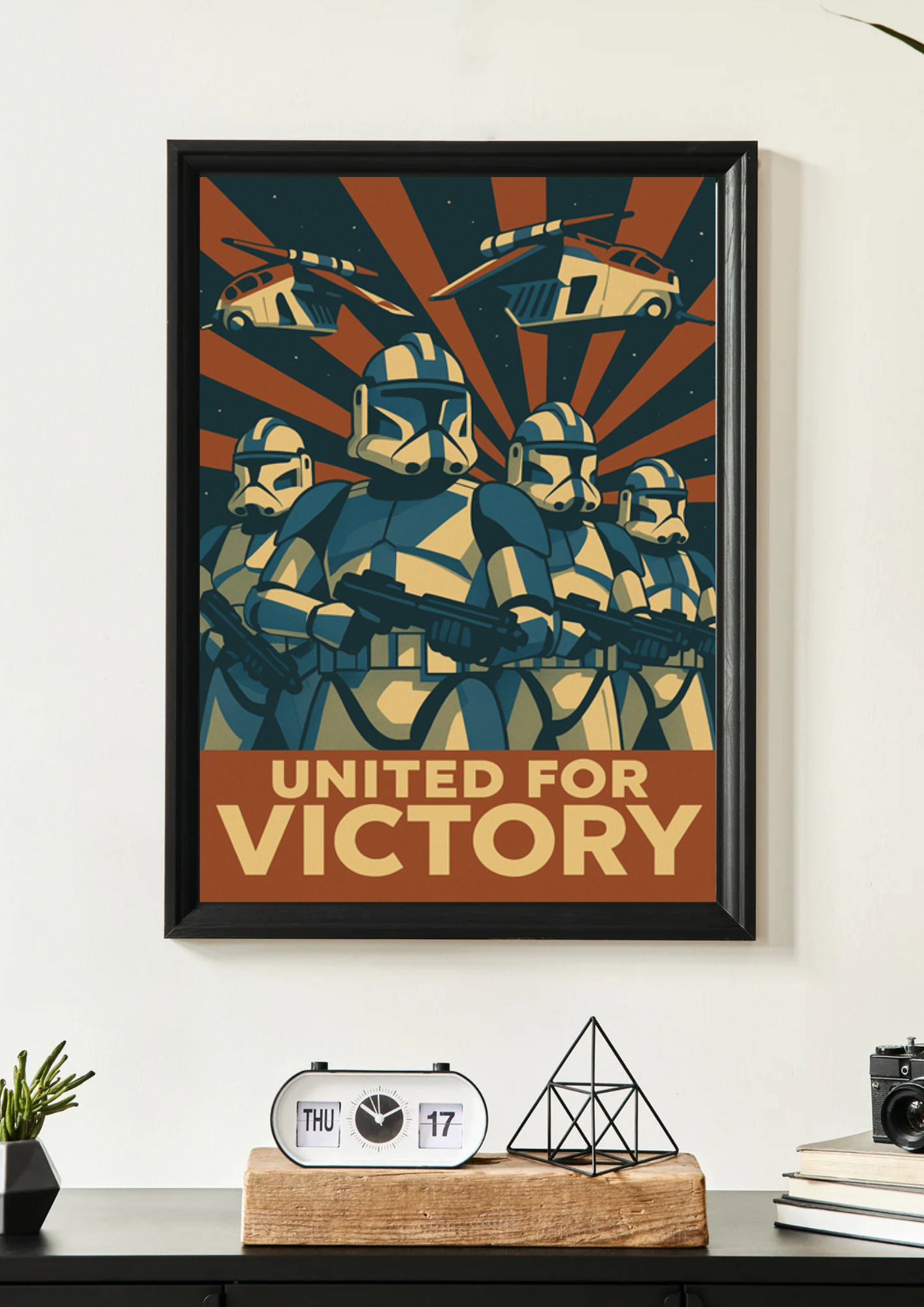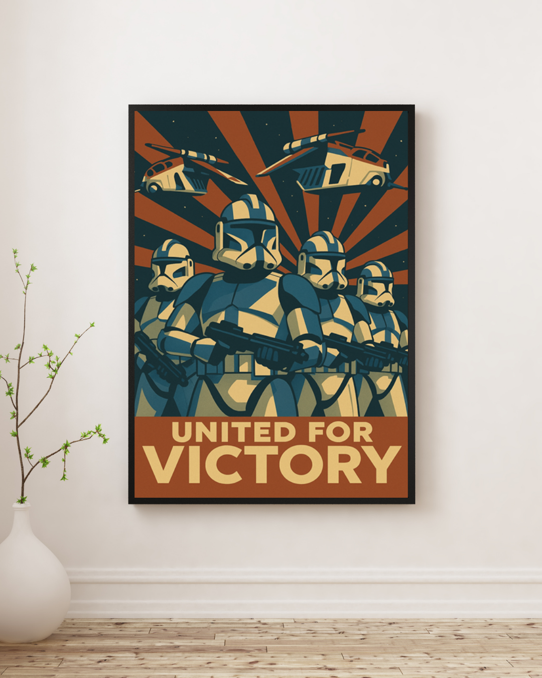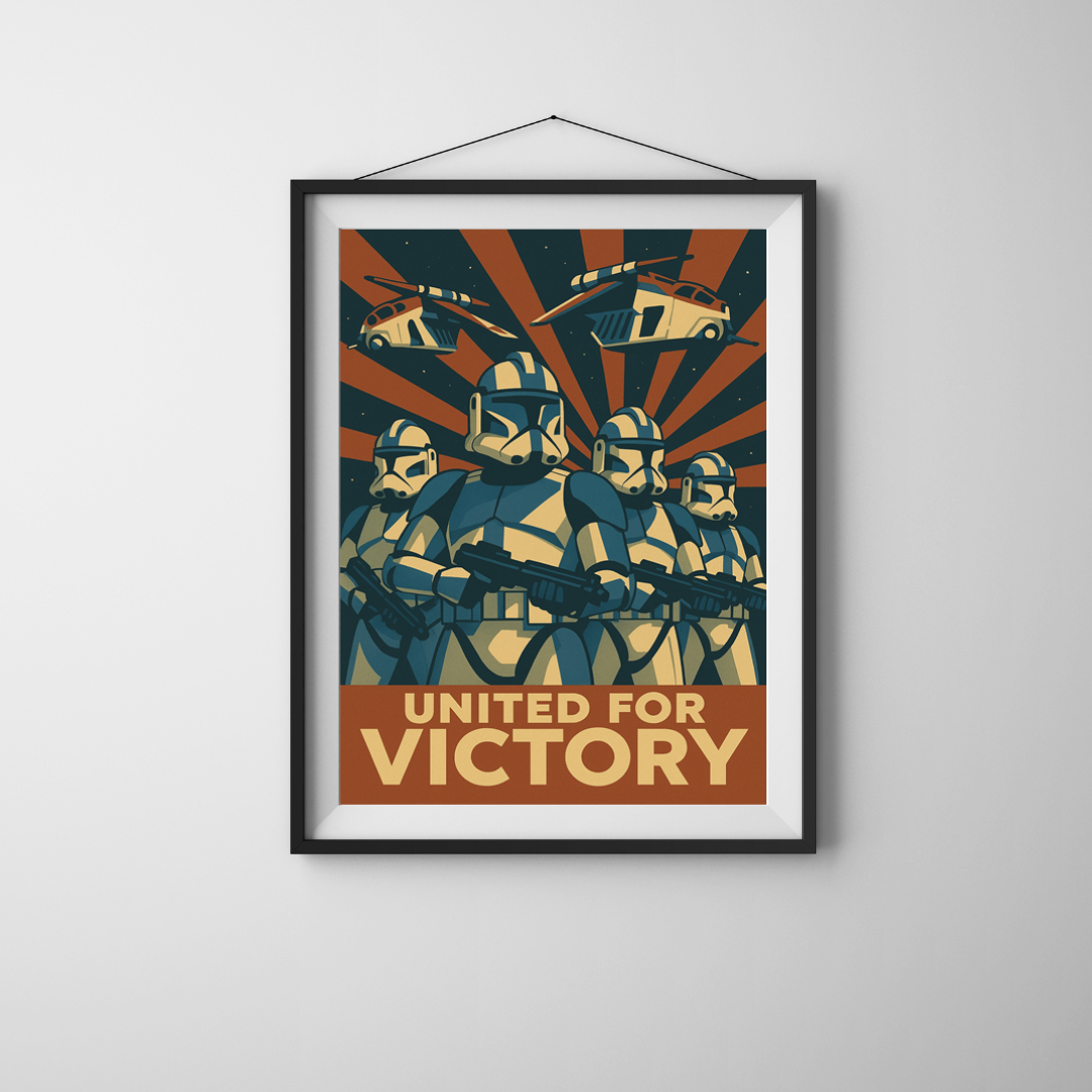 Limitowany plakat United for Victory inspirowany sagą Gwiezdnych Wojen oddaje potęgę Wielkiej Armii Republiki i charakterystyczny heroizm ery Wojen Klonów. W centrum grafiki stoi oddział żołnierzy-klonów w pełnym wyposażeniu – pewnych, skoncentrowanych i gotowych do działania. Ich sylwetki, ukazane w mocnych, kontrastowych kształtach, tworzą spójny front jedności i determinacji.