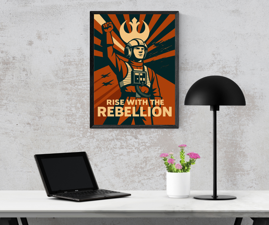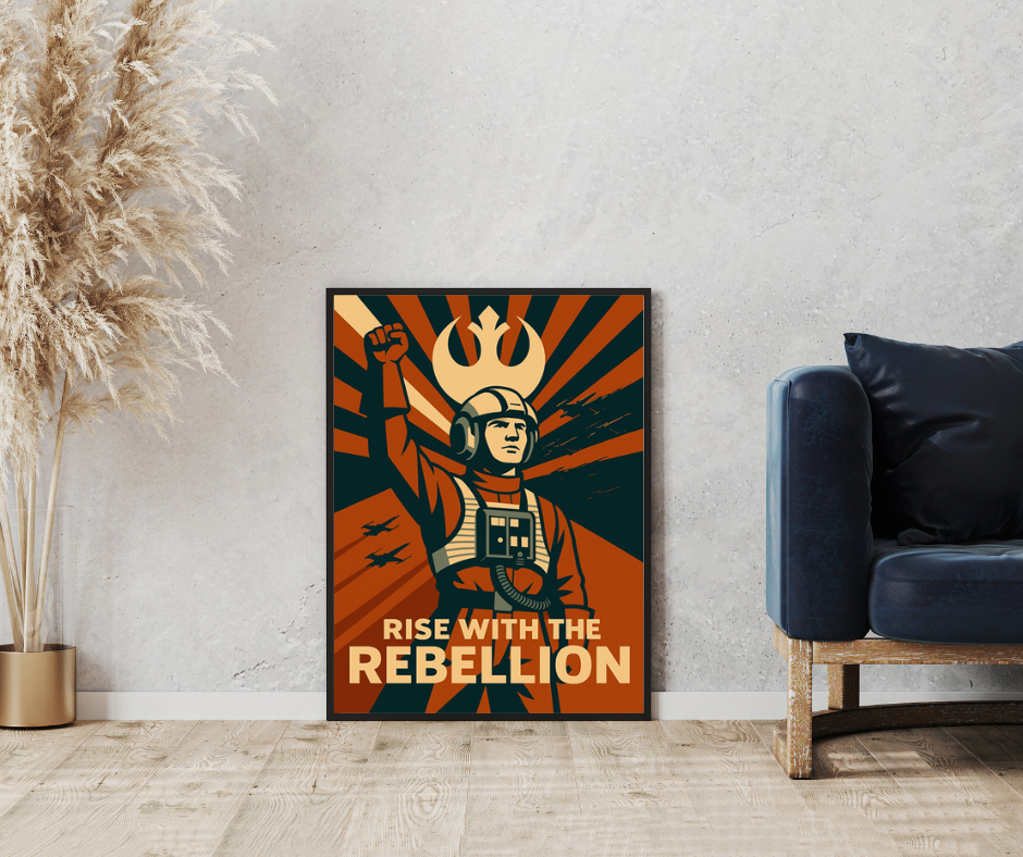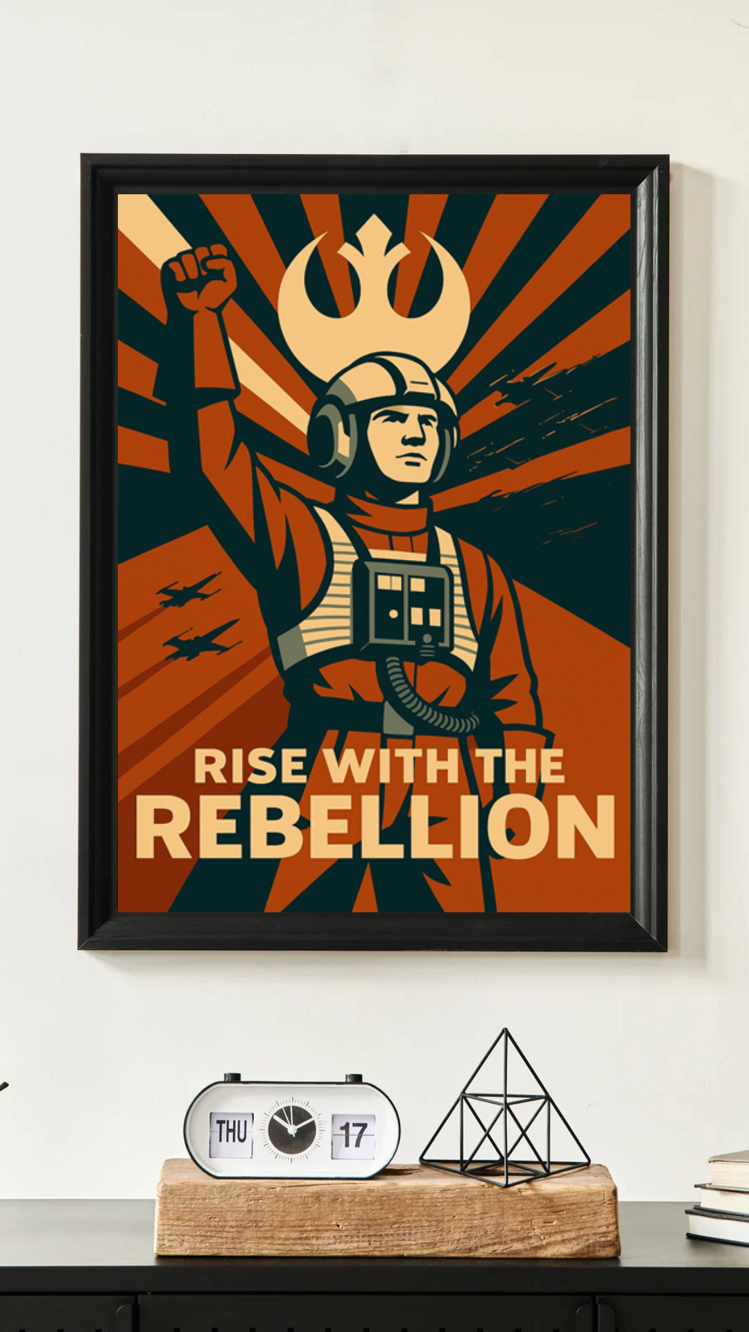Limitowany plakat Rise with the Rebellion inspirowany sagą Gwiezdnych Wojen to wizualny manifest oporu i determinacji. Centralną postacią kompozycji jest pilot Rebelii, unoszący zaciśniętą pięść ku górze — gest jednoznacznie kojarzony z buntem, solidarnością i gotowością do walki. Nad jego głową dominuje symbol Rebelii, który niczym znak nadziei góruje nad całą sceną.