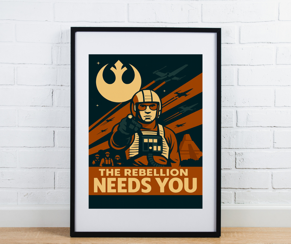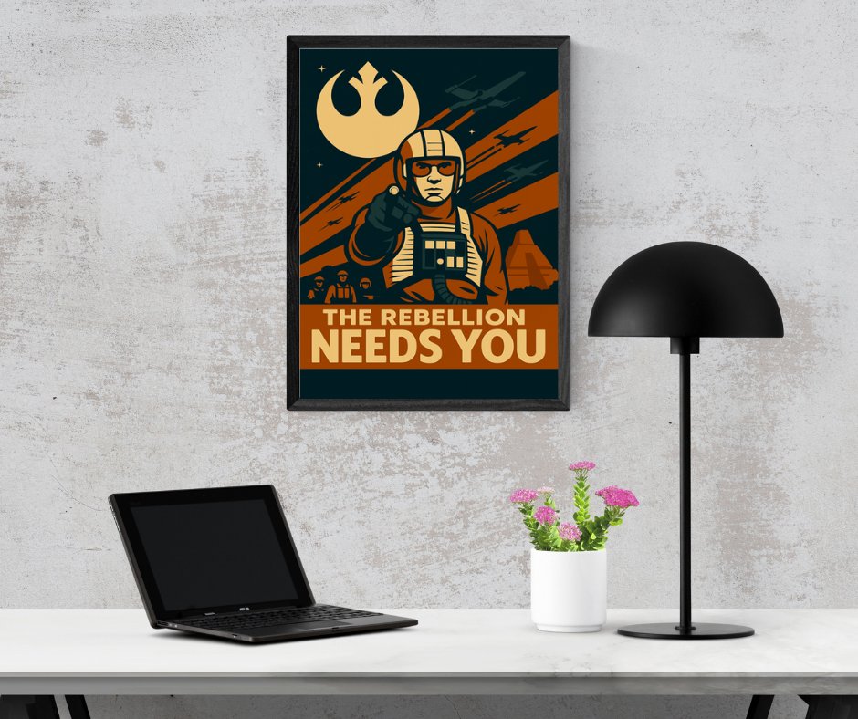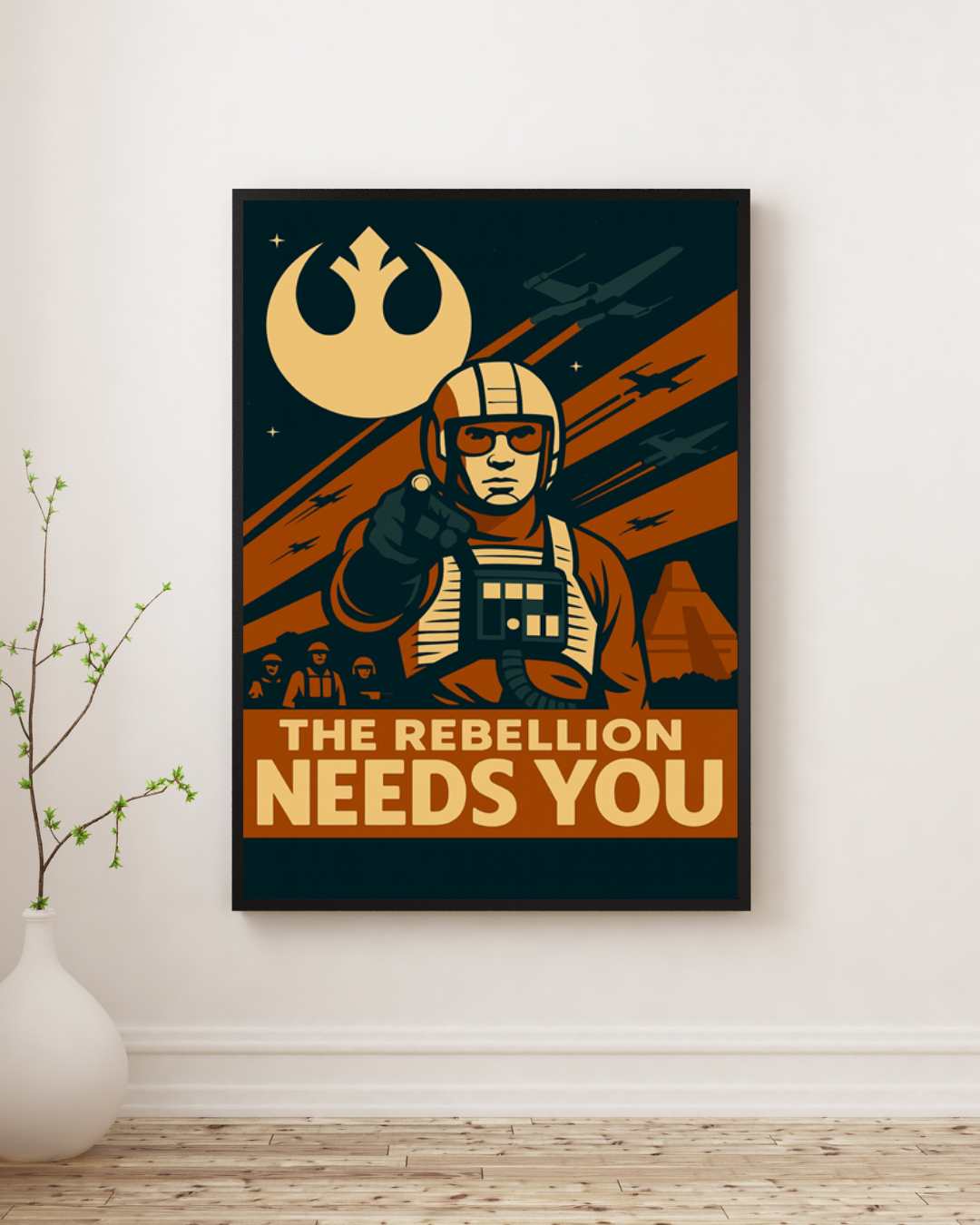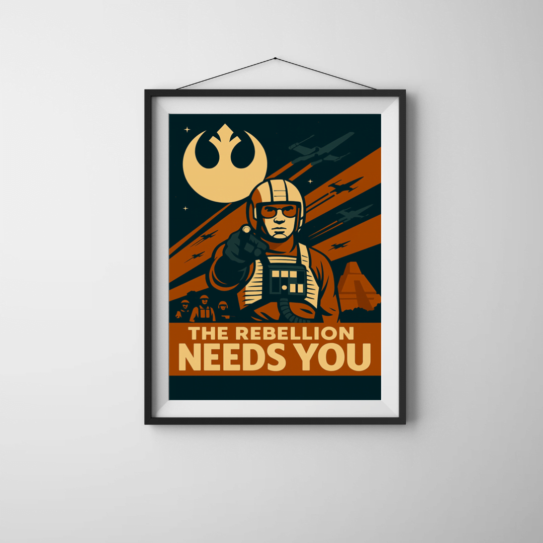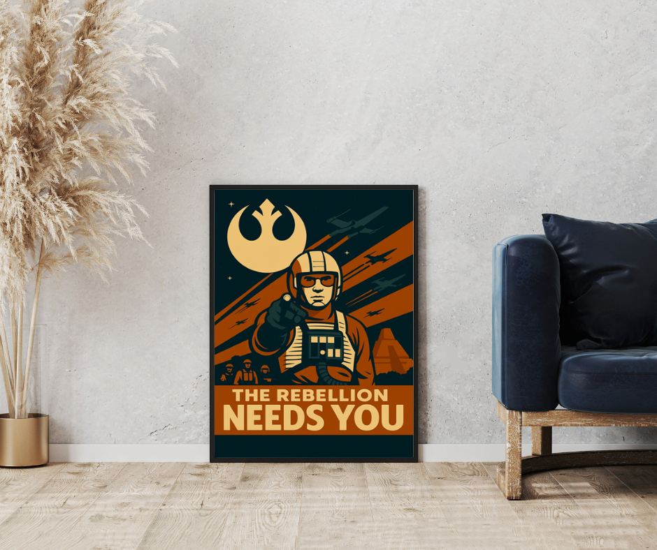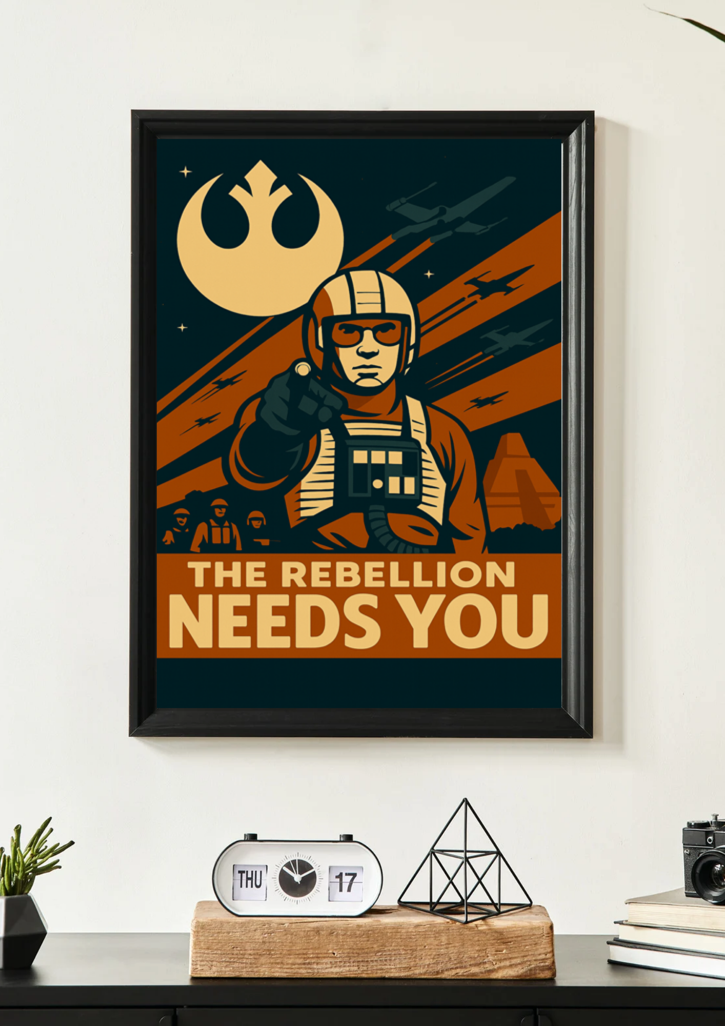 Limitowany plakat The Rebellion Needs You inspirowany sagą Gwiezdnych Wojen to współczesna interpretacja kultowych plakatów rekrutacyjnych, osadzona w realiach wielkiej galaktycznej walki między Wolnymi Planetami, a Imperium. W centralnej części kompozycji znajduje się pilot Rebelii, który – w charakterystycznym geście „You!” – wskazuje prosto na widza, tworząc bezpośrednie i emocjonalne wezwanie: Rebelia potrzebuje właśnie Ciebie.