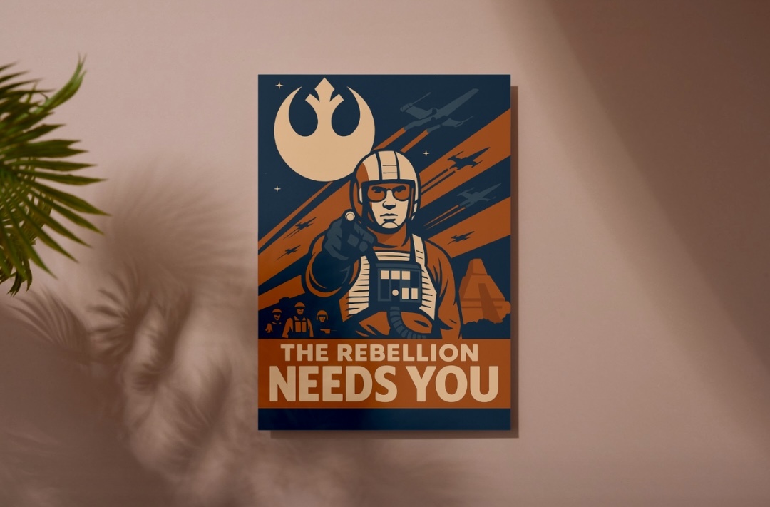 Unikalny plakat w formacie A3 przedstawiający pilota Rebelii w dynamicznym, propagandowym stylu graficznym. Intensywne barwy pomarańczy, czerni i beżu nadają mu wyjątkowy charakter i sprawiają, że świetnie wyróżnia się na ścianie. Plakat drukowany jest na wysokiej jakości papierze, co zapewnia trwałość kolorów i ostrość detali. To doskonały element wystroju dla każdego fana Gwiezdnych Wojen - świetnie prezentuje się zarówno samodzielnie, jak i w zestawie z innymi plakatami z tej serii.