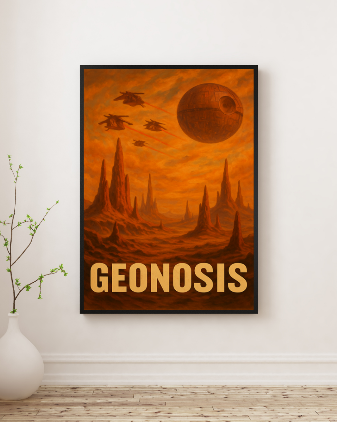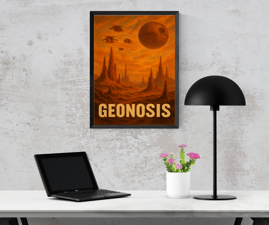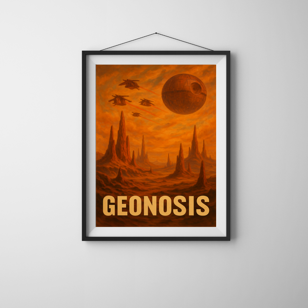 Limitowany plakat, inspirowany sagą Gwiezdnych Wojen, przedstawia planetę Geonosis – miejsce narodzin armii droidów Separatystów oraz kluczową lokalizację w historii galaktycznego konfliktu. Surowy, skalisty krajobraz, charakterystyczne iglice skalne i intensywnie pomarańczowa paleta barw oddają niepowtarzalny klimat tej pustynnej planety znanej z Ataku Klonów.