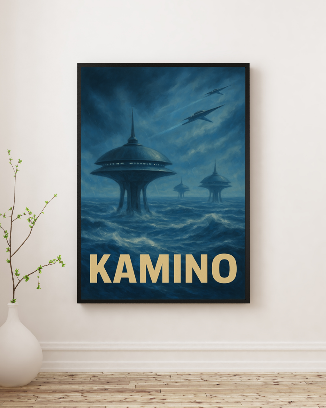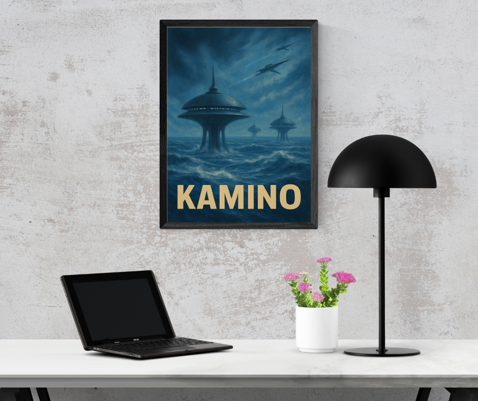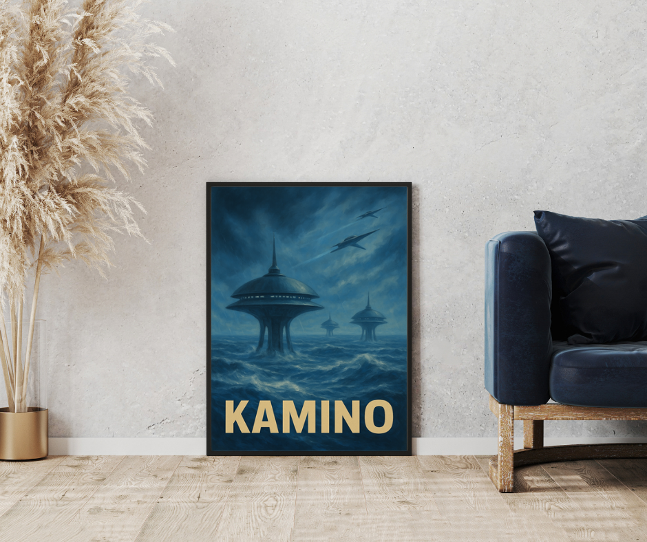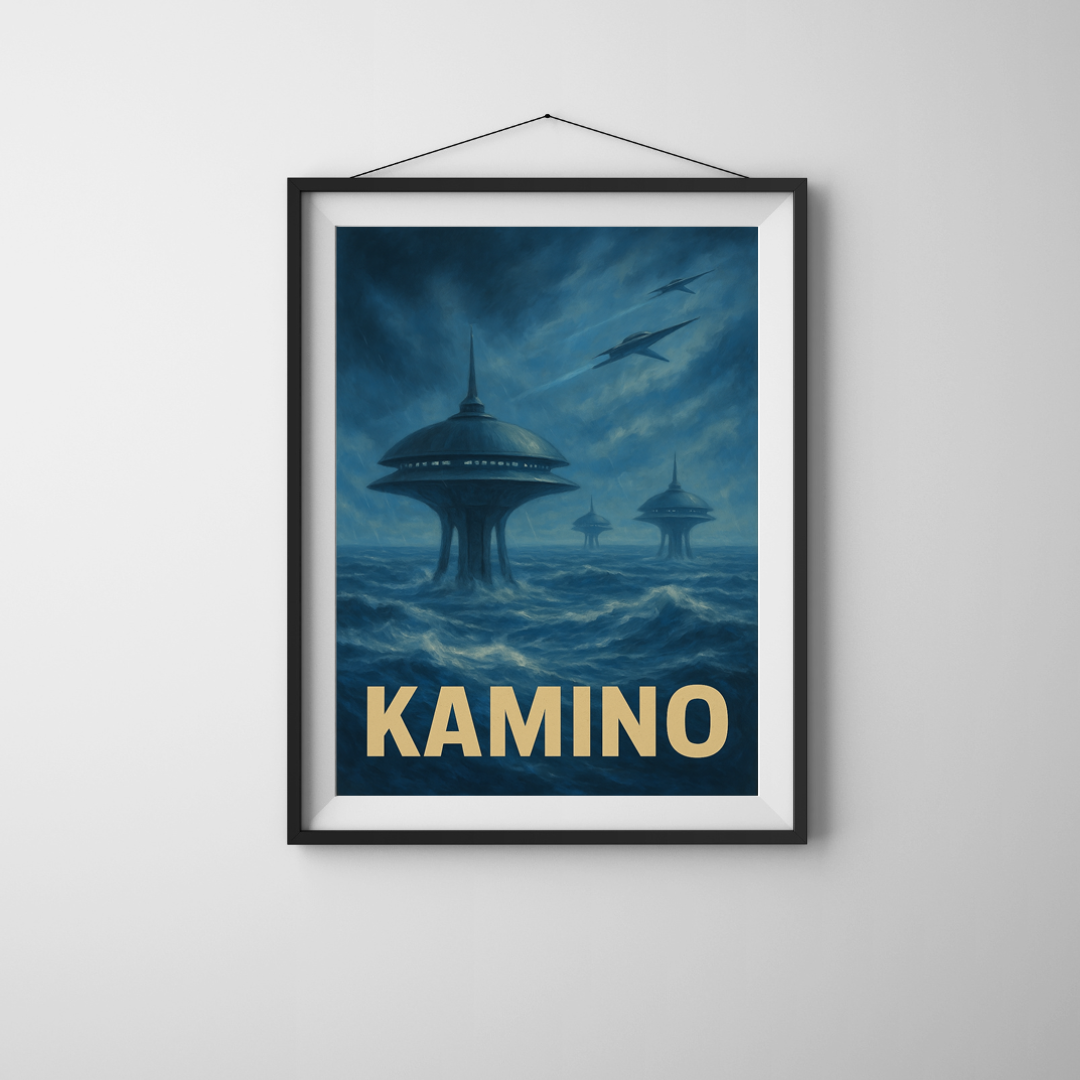 Limitowany plakat inspirowany sagą Gwiezdnych Wojen przedstawia Kamino – jedną z najbardziej rozpoznawalnych planet w uniwersum. Nieskończone, wzburzone oceany i monumentalne, smukłe struktury wynurzające się z morskiej głębi tworzą niepowtarzalną atmosferę, którą znają wszyscy fani serii.