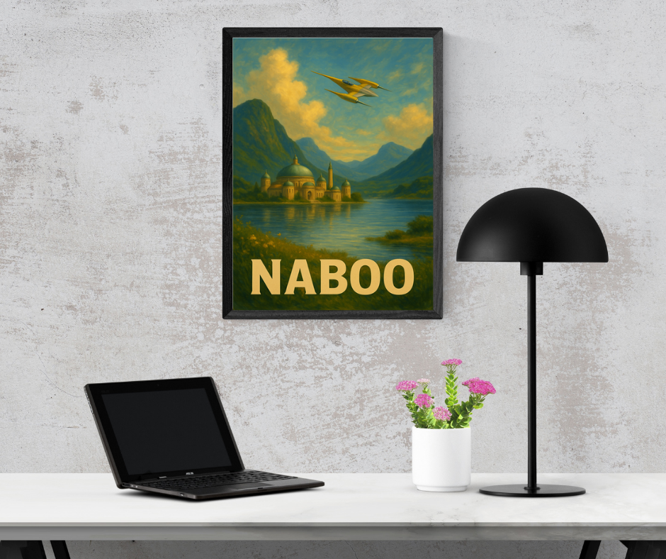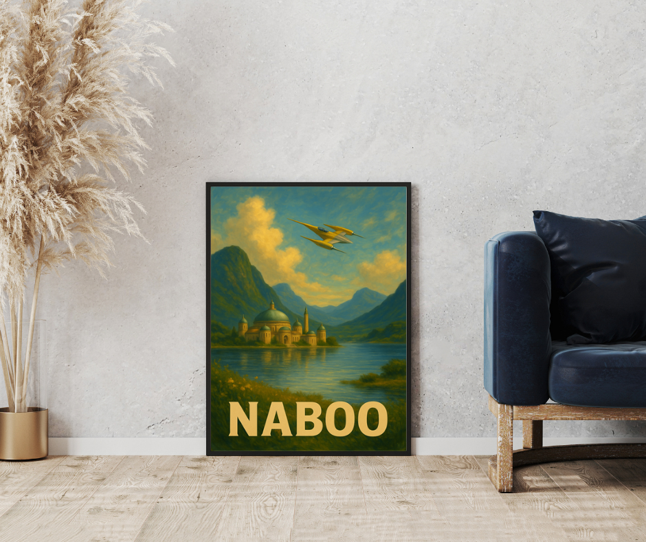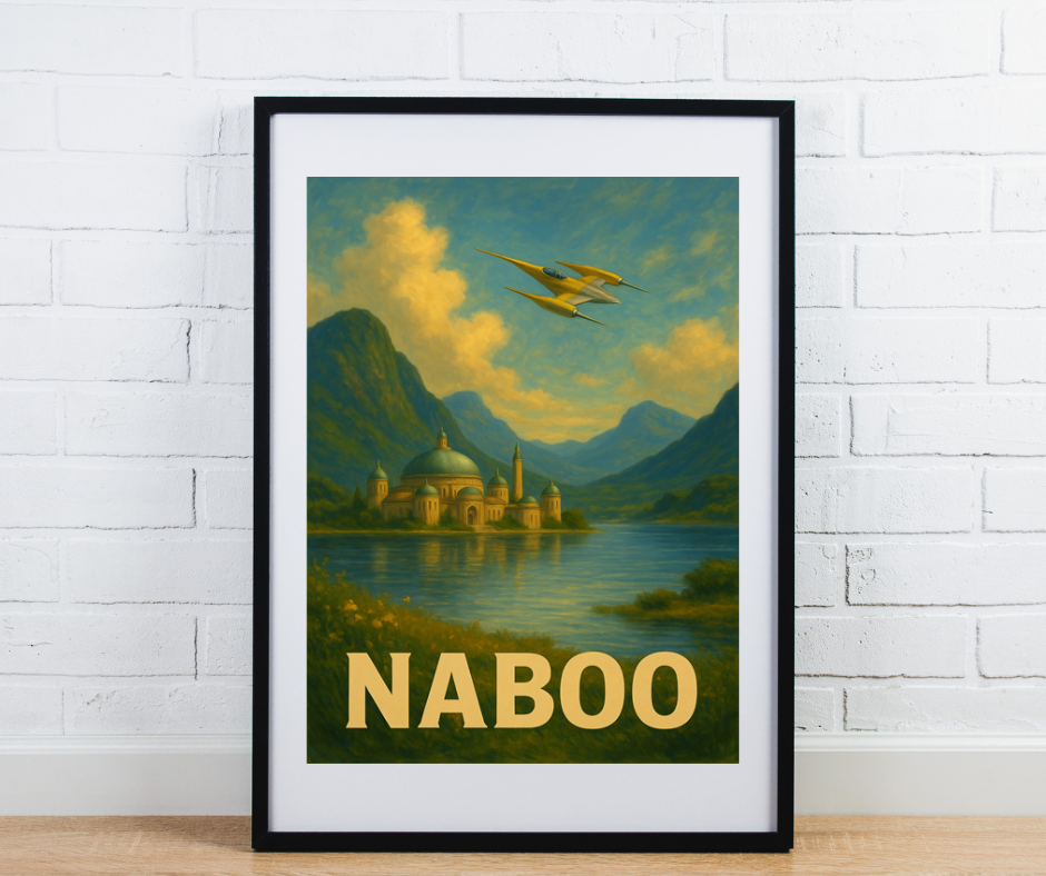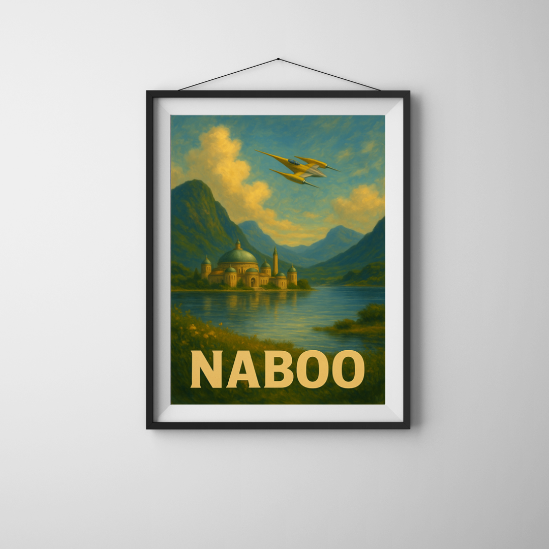 Limitowany plakat Naboo inspirowany sagą Gwiezdnych Wojen, przedstawia jedną z najbardziej malowniczych planet tego uniwersum — harmonijne połączenie kultury, architektury i natury. Ilustracja ukazuje monumentalne pałace nad spokojną taflą jeziora, otoczone roślinnością i miękkim światłem zachodzącego słońca. Z perspektywy klasycznej kolumnady widać niezwykłą architekturę Theed, tworząc kompozycję elegancką, bogatą i niezwykle filmową.