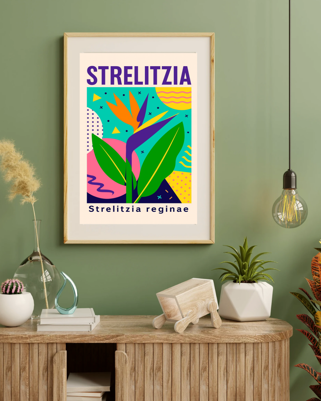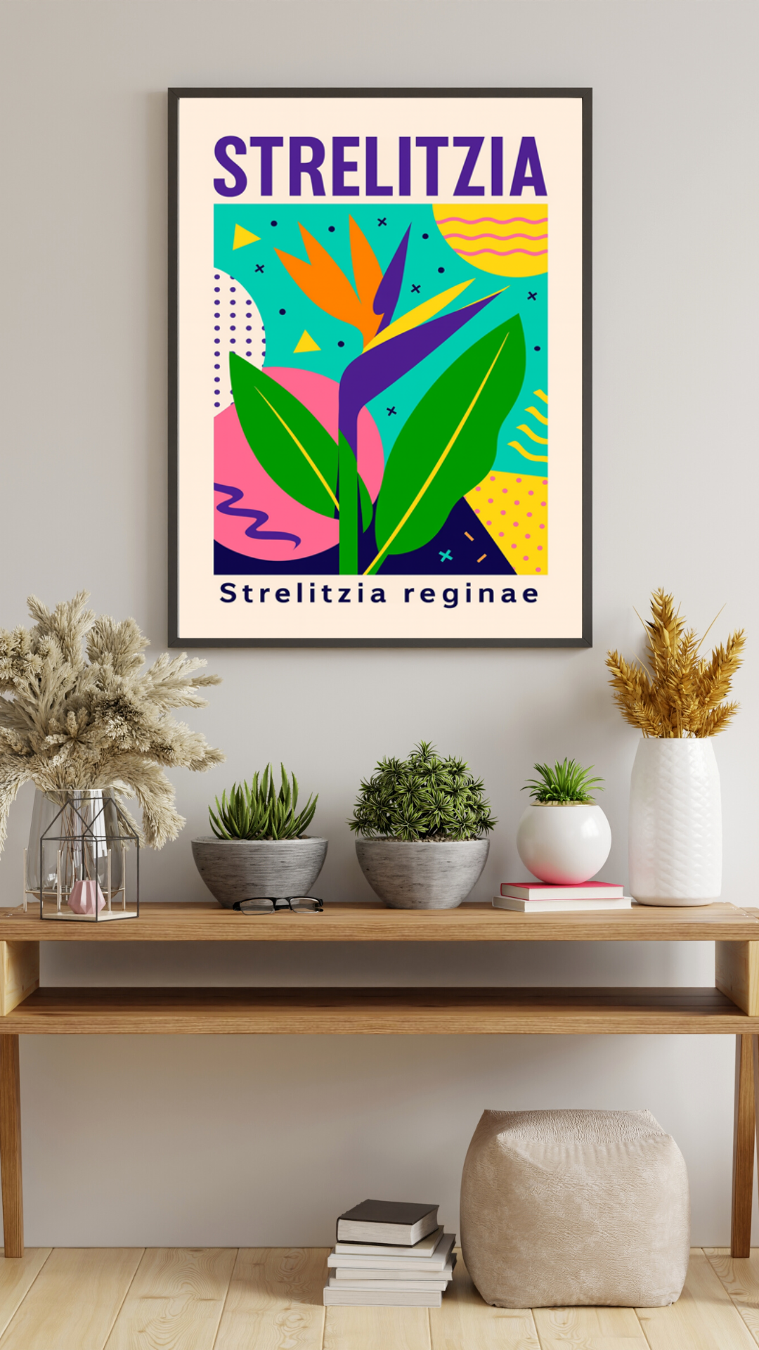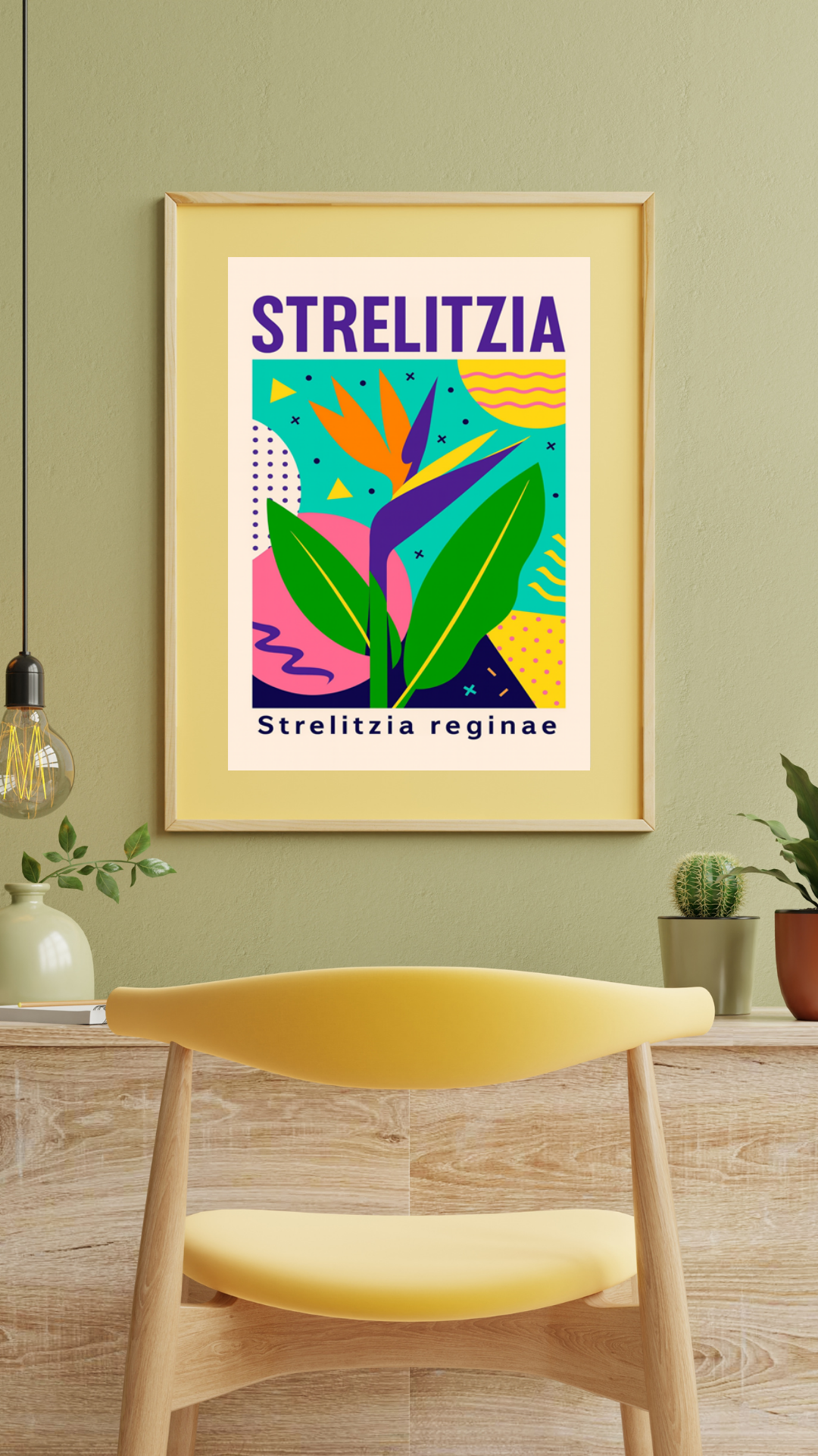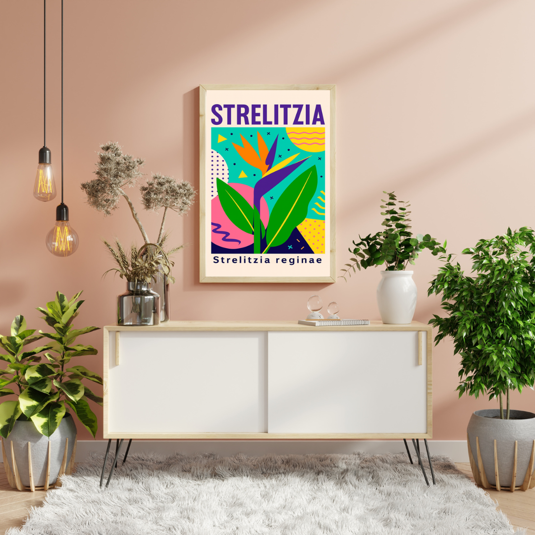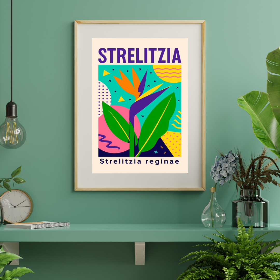 Plakat Strelitzia to artystyczna interpretacja jednej z najbardziej efektownych roślin tropikalnych – strelicji królewskiej, nazywanej również „rajem ptaków”. Charakterystyczny kształt kwiatu został przedstawiony w nowoczesnej, ilustracyjnej formie, łączącej botaniczną inspirację z estetyką współczesnego designu.