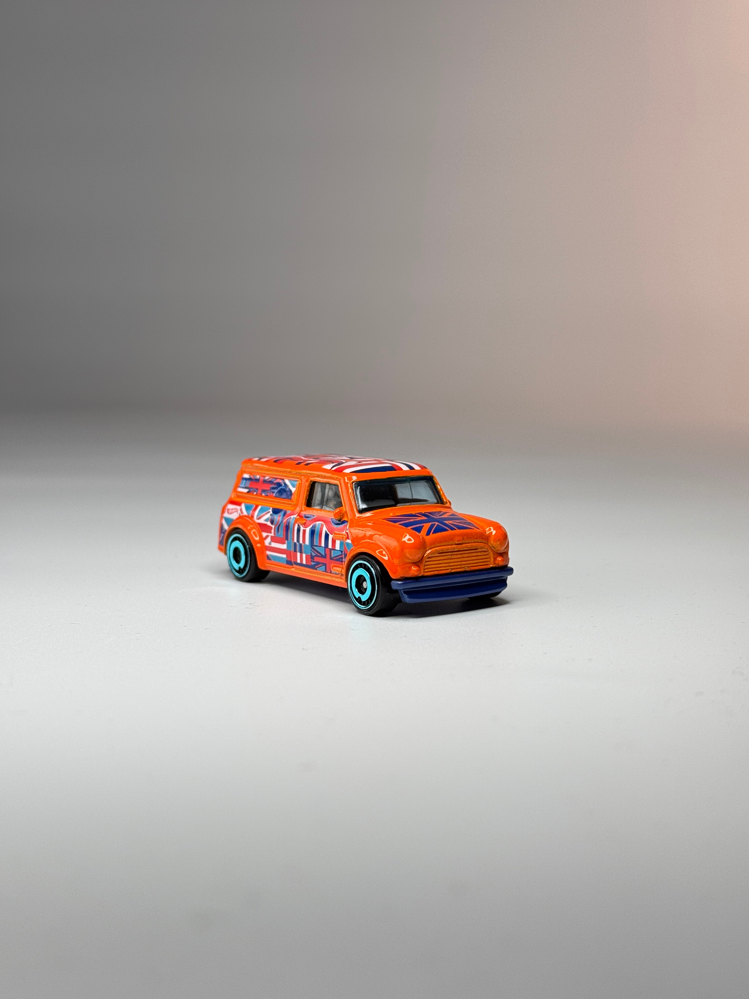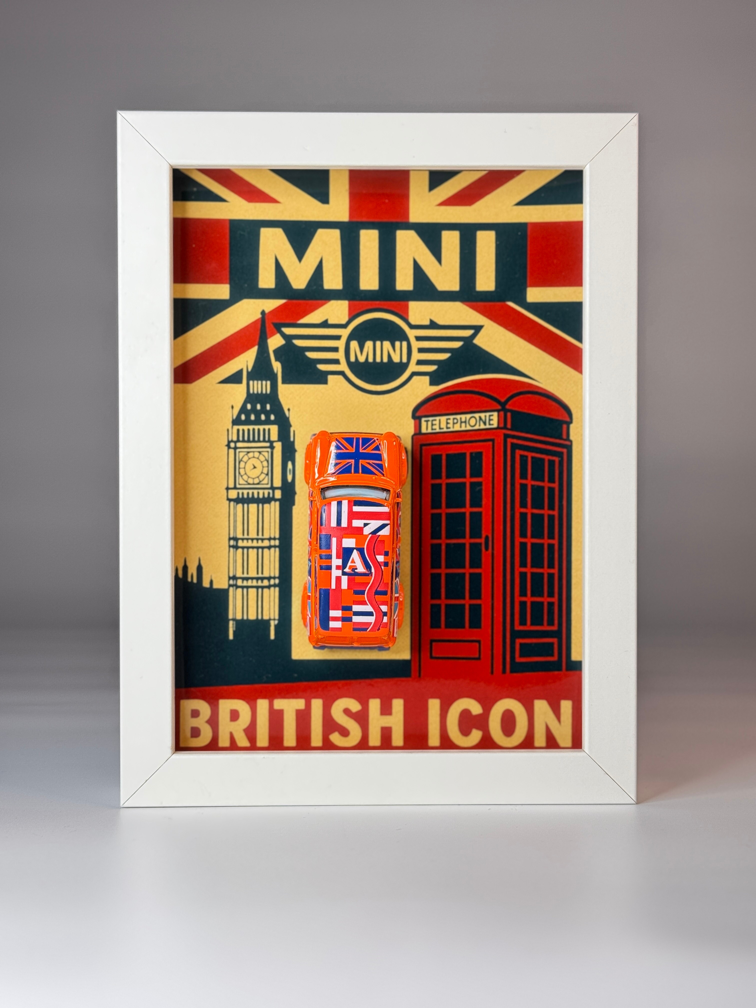 Ta wyjątkowa ramka łączy w sobie brytyjski styl, klasyczny design MINI oraz kolekcjonerski charakter modeli Hot Wheels. Tło w stylu retro przedstawia najbardziej rozpoznawalne symbole Wielkiej Brytanii — Big Ben, czerwoną budkę telefoniczną i pełną dumy Union Jack — tworząc idealne tło dla miniaturowego modelu MINI, który sam w sobie jest ikoną motoryzacji.