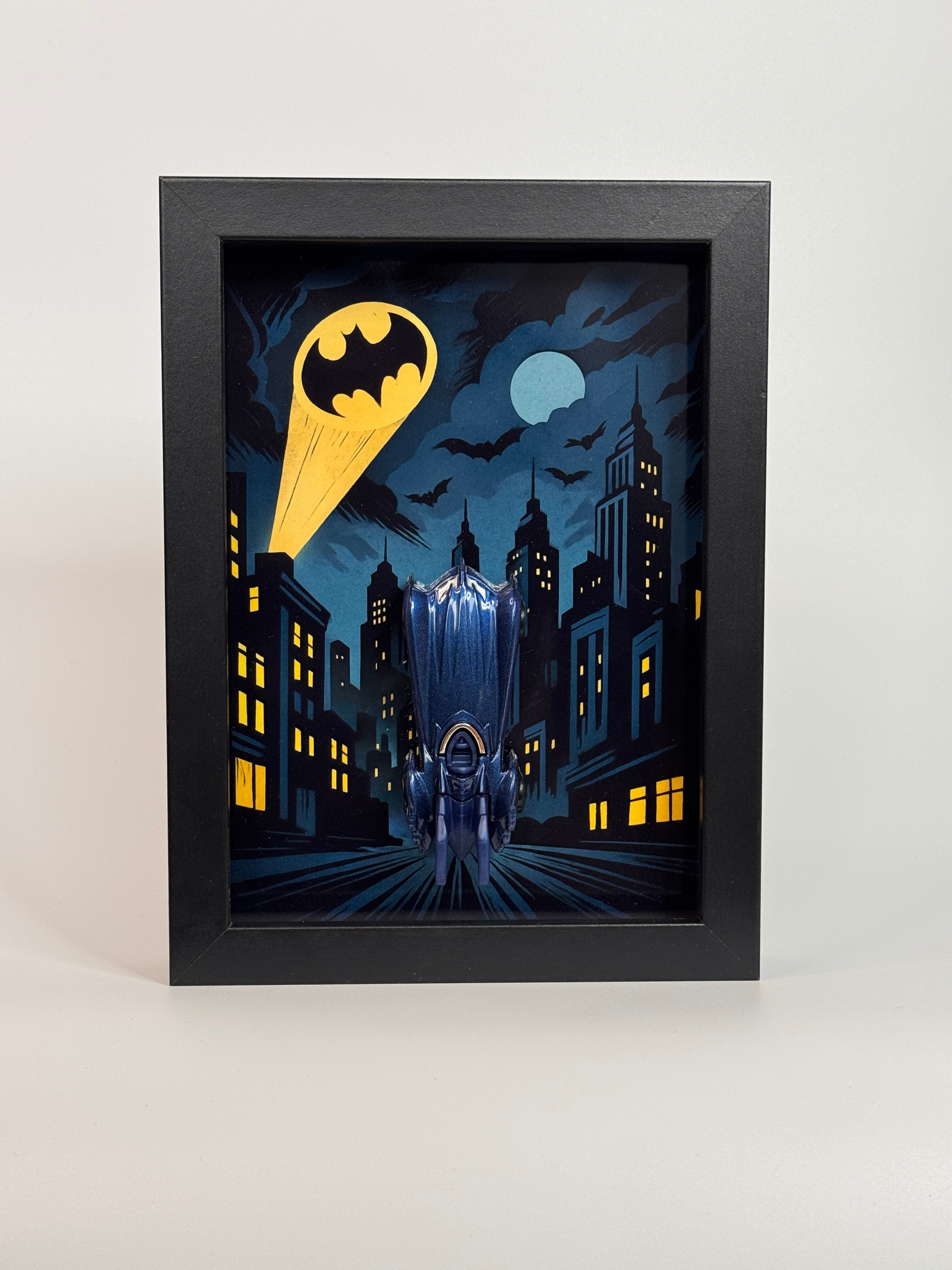 Prezentujemy kolekcjonerską ramkę 3D Magnetifit z modelem Batmobile — ikoną popkultury, stylu i mrocznego klimatu Gotham City. Oryginalny model Hot Wheels został osadzony na tłem inspirowanym komiksową stylistyką DC: nocne miasto, księżyc, dramatyczne światła w oknach i charakterystyczny Bat-Sygnał rozświetlający niebo. To kompozycja, która natychmiast przyciąga wzrok i przenosi do świata jednego z najbardziej kultowych superbohaterów.