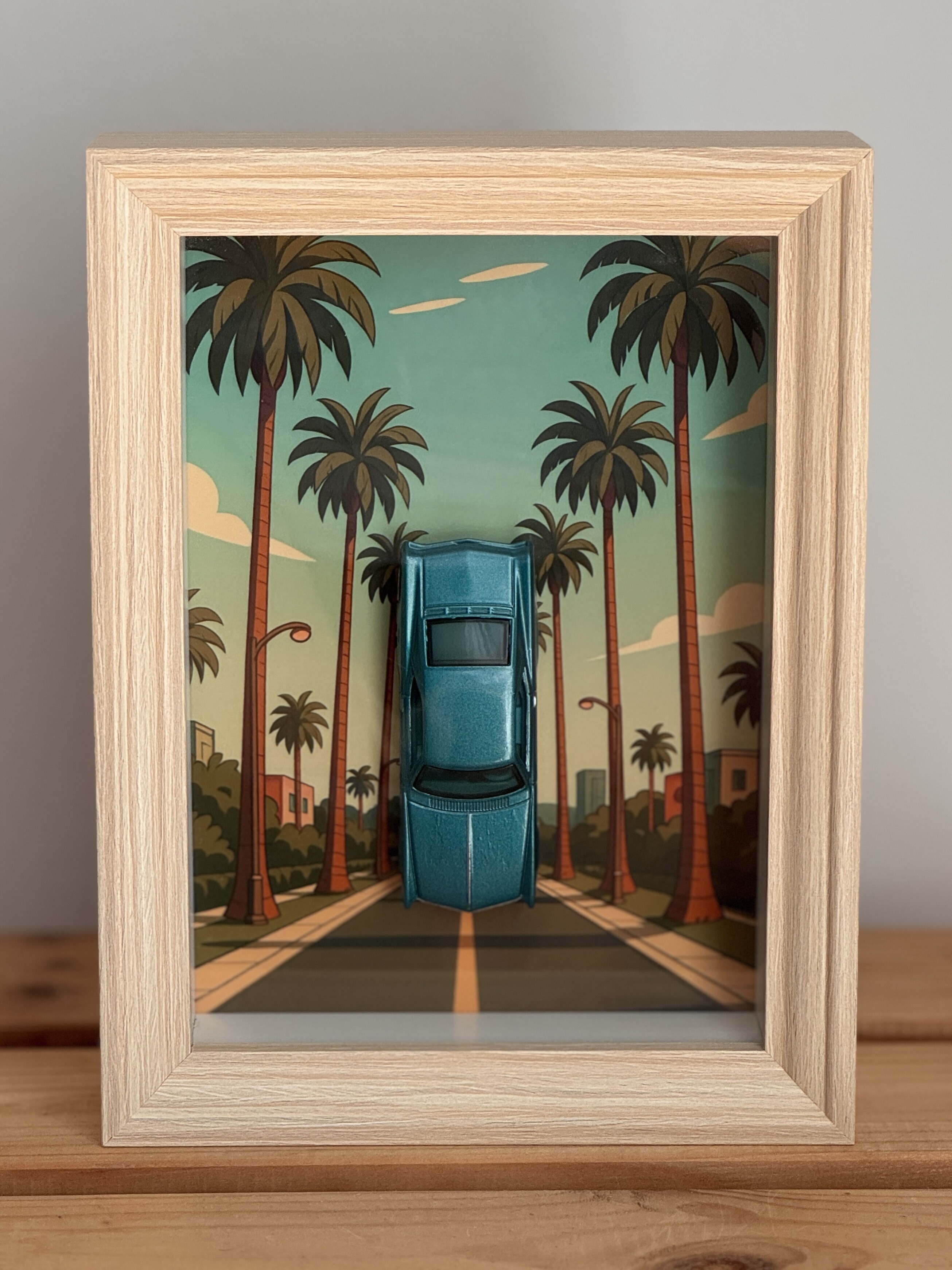 W zestawie otrzymujesz ramkę, model Hot Wheels oraz autorską grafikę dopasowaną do auta.