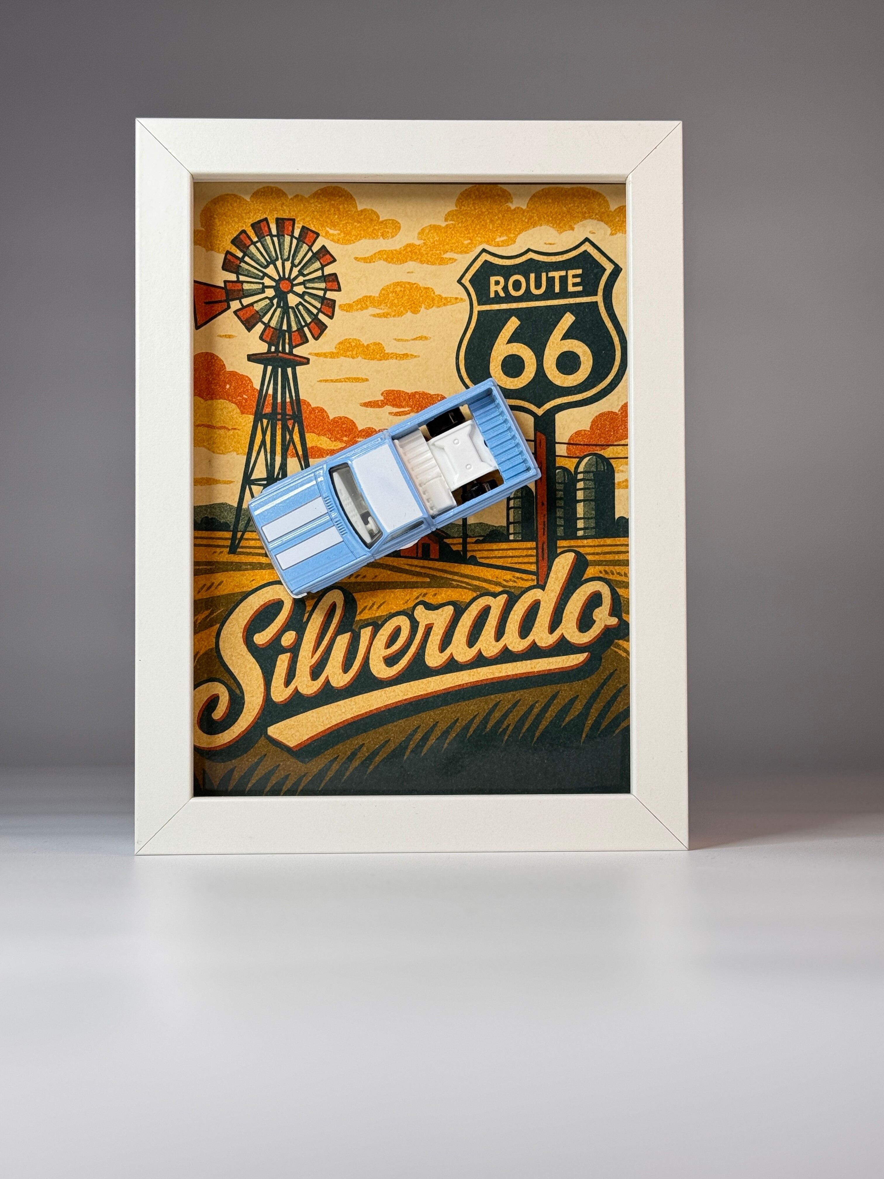 Ramka kolekcjonerska z modelem Chevrolet Silverado to hołd dla amerykańskiej motoryzacji, wolności i legendarnych podróży drogą Route 66. Klimatyczna grafika w stylu vintage przenosi prosto na prerię – w stronę zachodzącego słońca, wiatraków, pól i kultowego oznaczenia trasy. To dekoracja, która łączy duch amerykańskiego road-tripu z wyjątkowym charakterem klasycznego pick-upa.