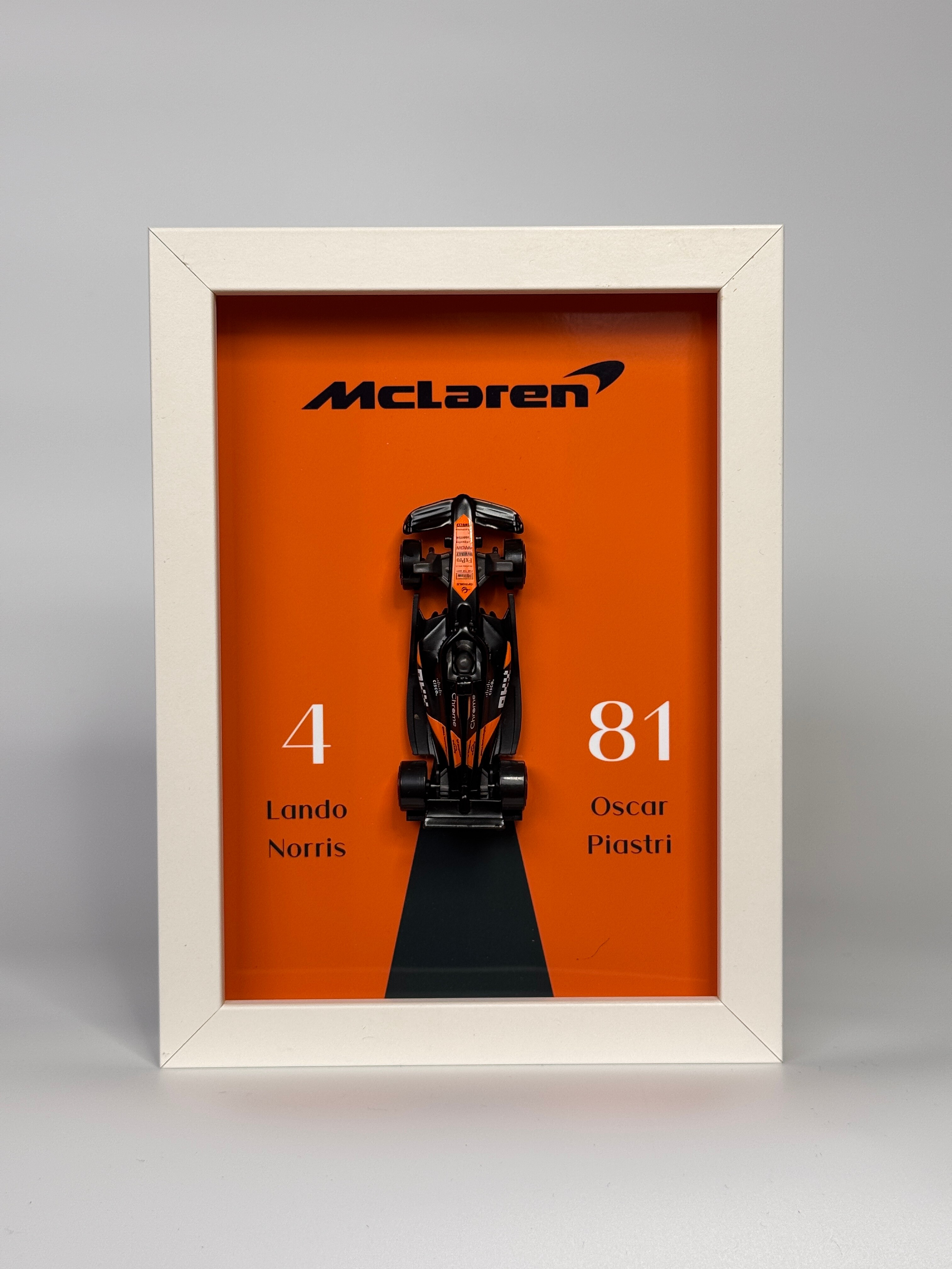 Przedstawiamy kolekcjonerską ramkę 3D Magnetifit z bolidem McLaren F1 — jedną z najbardziej rozpoznawalnych ikon współczesnej Formuły 1. Oryginalny model Hot Wheels w charakterystycznym „papaya orange” prezentuje się na tle intensywnej, minimalistycznej grafiki inspirowanej identyfikacją wizualną zespołu. Centralnie ustawiony bolid i torowy motyw tworzą dynamiczną kompozycję, która przyciąga wzrok i doskonale oddaje klimat nowoczesnego McLarena.