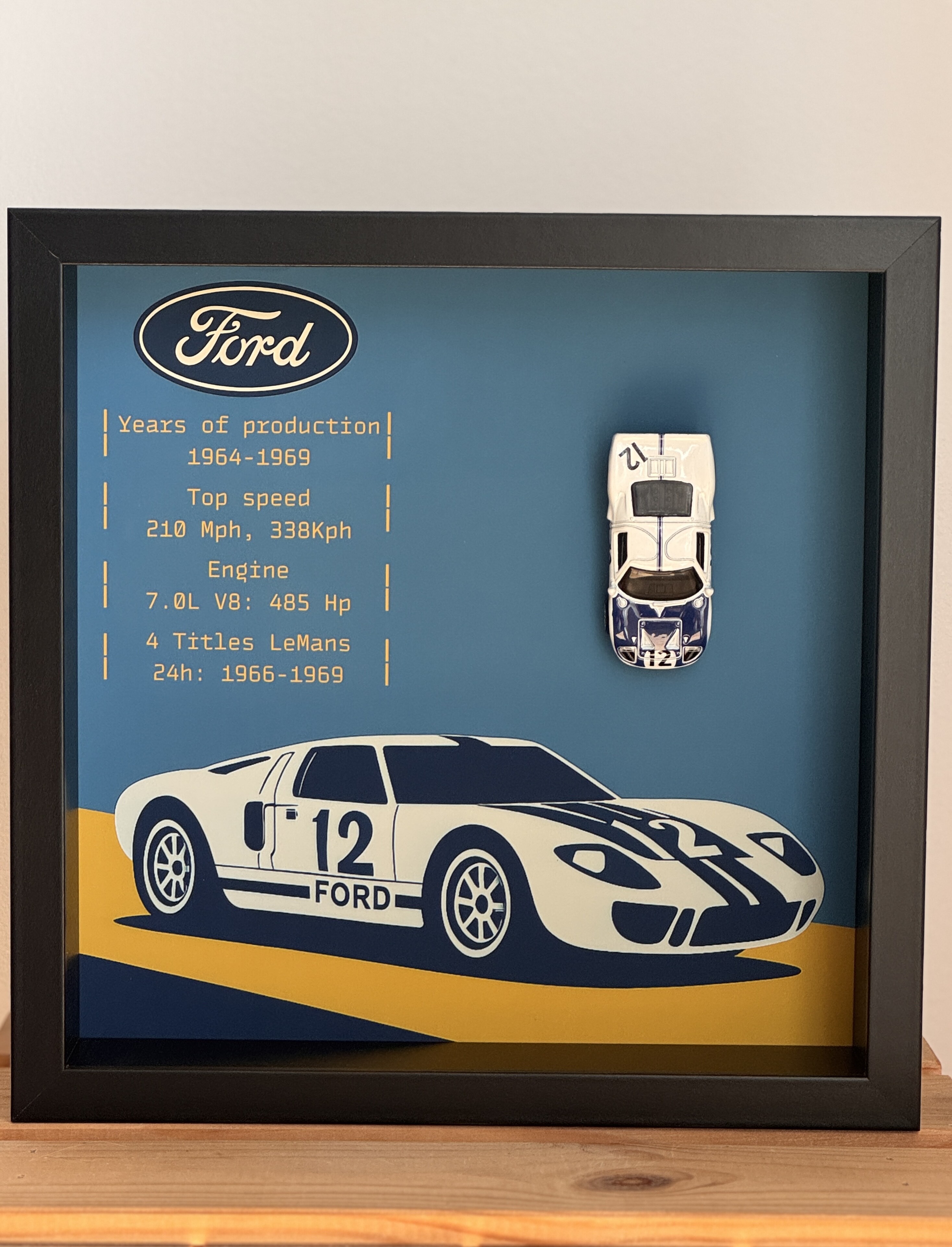 W zestawie otrzymujesz ramkę, model Hot Wheels oraz autorską grafikę dopasowaną do auta.
