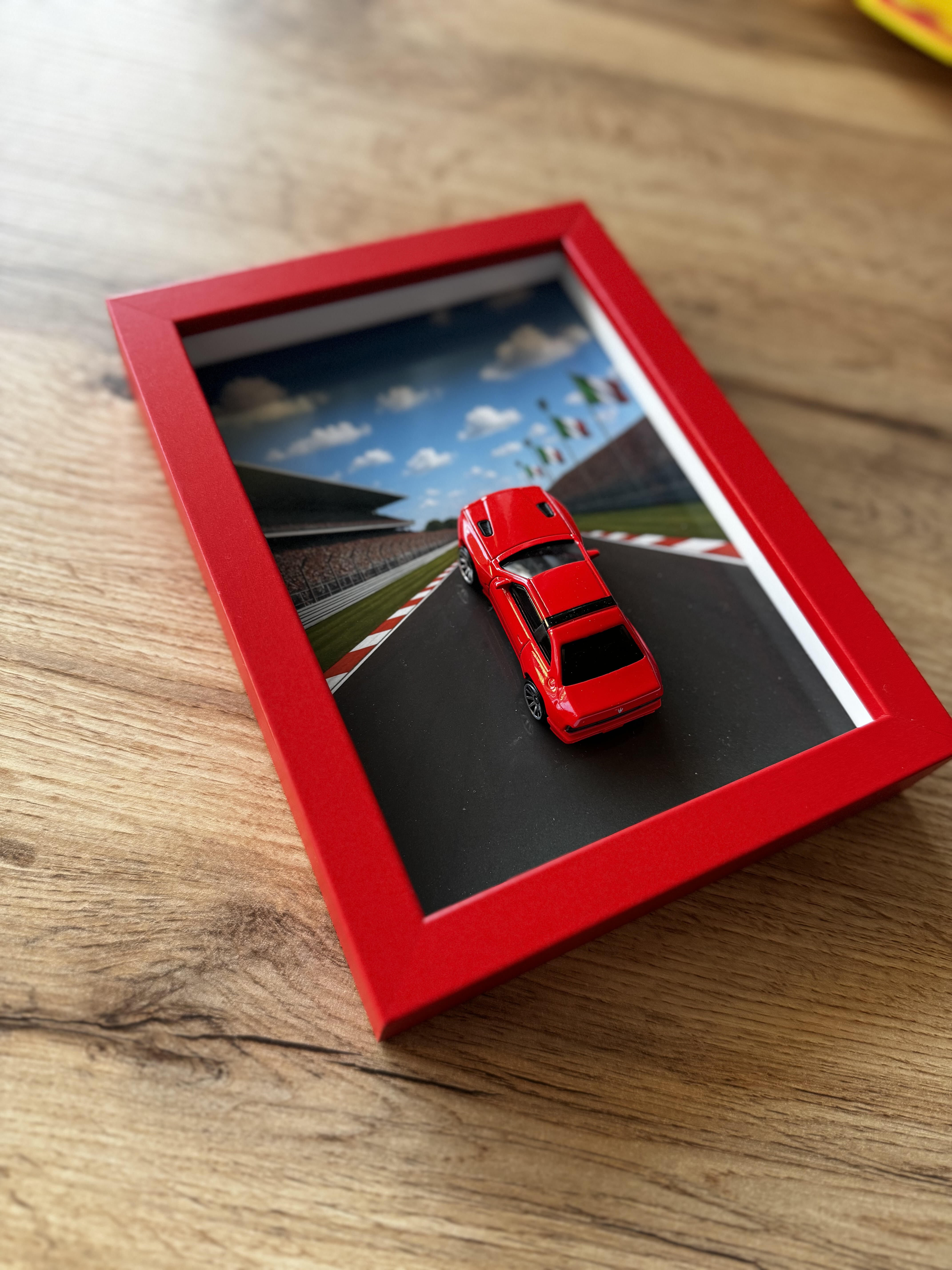 W zestawie otrzymujesz ramkę, model Hot Wheels oraz autorską grafikę dopasowaną do auta.