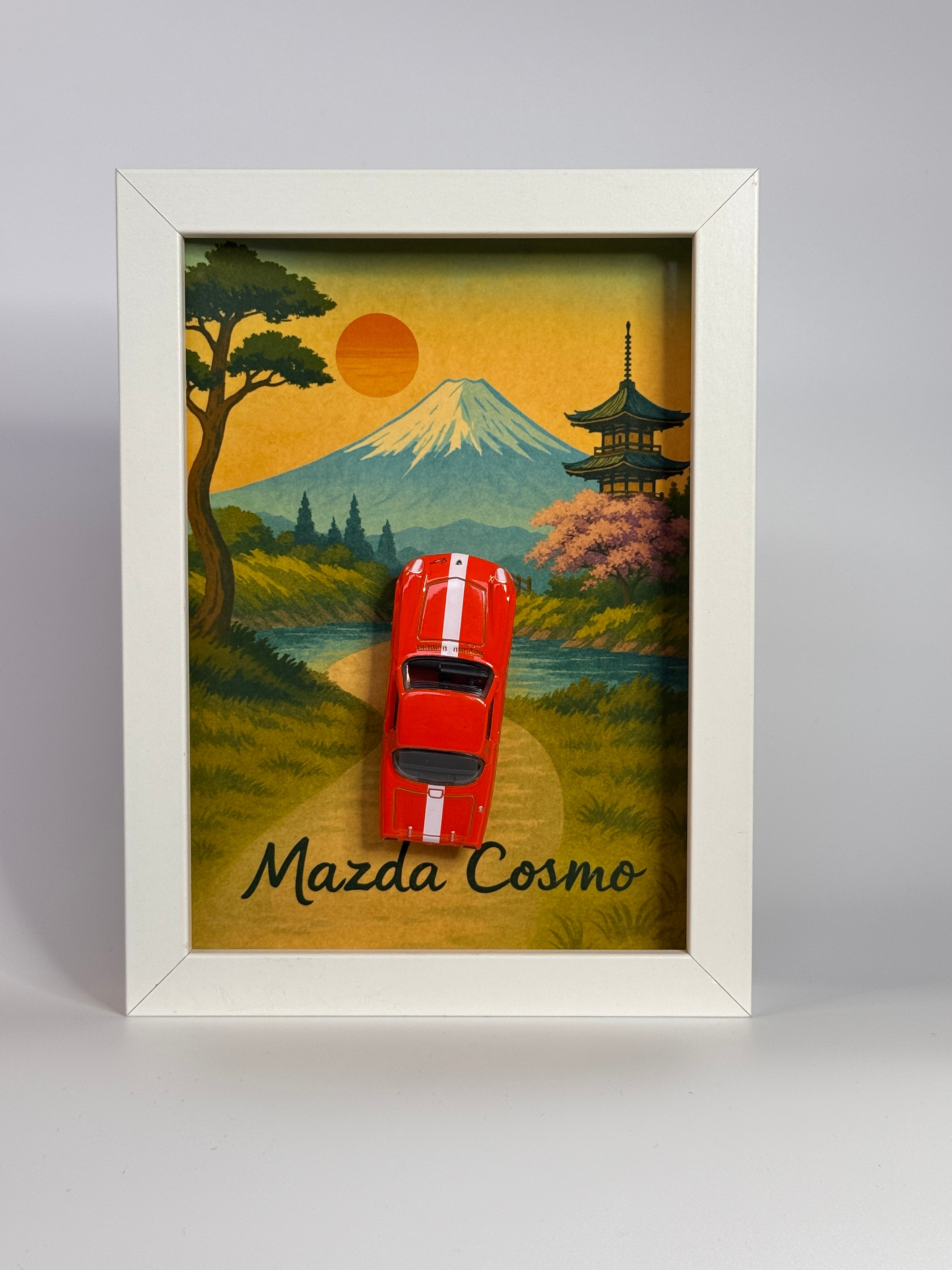 Prezentujemy kolekcjonerską ramkę 3D Magnetifit z modelem Mazda Cosmo, jednym z najbardziej kultowych samochodów w historii japońskiej motoryzacji. Oryginalny model Hot Wheels w intensywnym pomarańczowym kolorze został osadzony na tle inspirowanym klasyczną estetyką Japonii — z majestatyczną górą Fuji, malowniczą pagodą oraz zachodem słońca w ciepłej, nostalgicznej palecie barw. Całość tworzy wyjątkowy klimat vintage, nawiązujący do lat świetności Cosmo i jej stylu pełnego elegancji oraz charakteru.