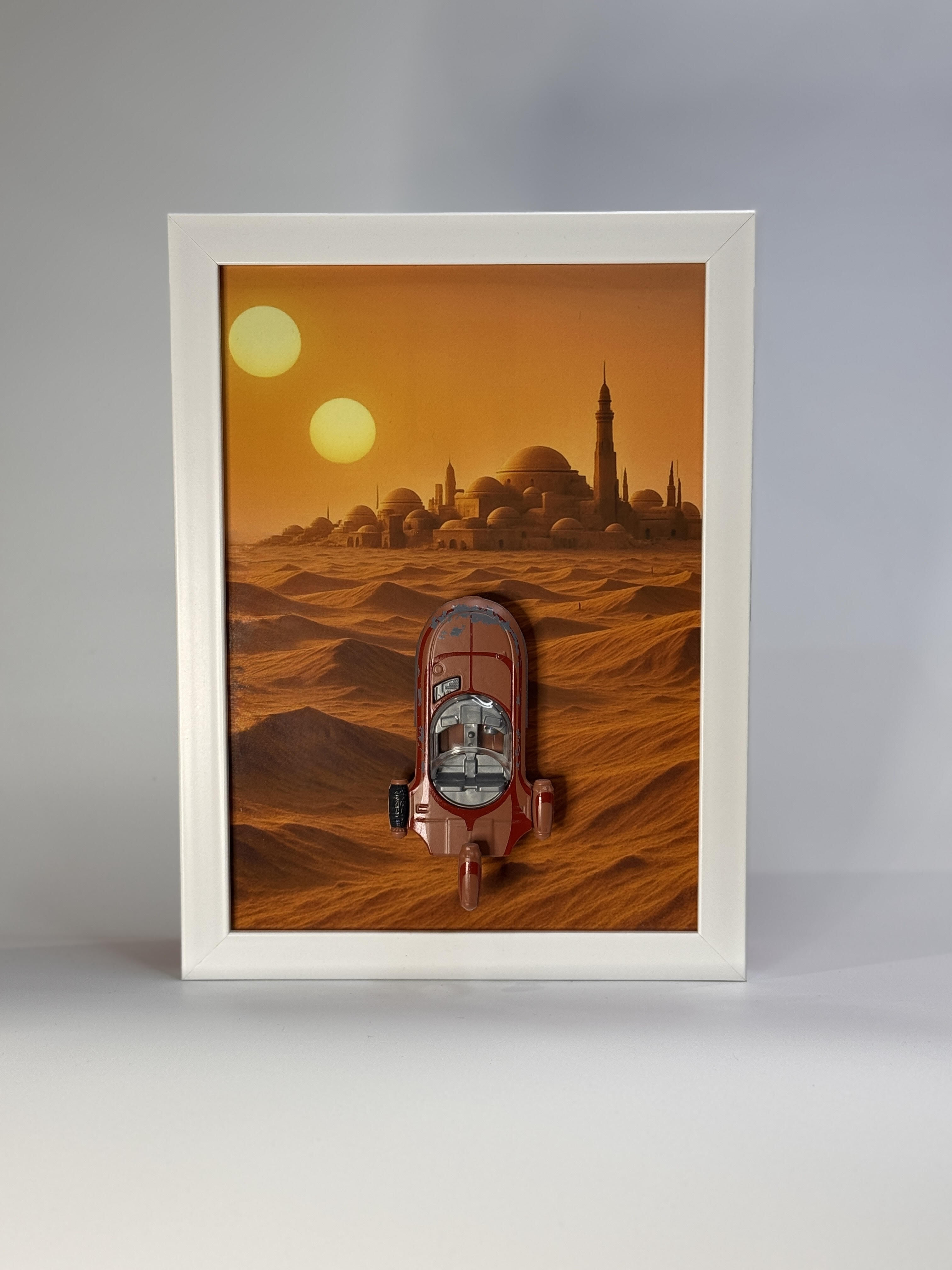 Przedstawiamy kolekcjonerską ramkę 3D Magnetifit z kultowym pojazdem X-34 Landspeeder — jednym z najbardziej rozpoznawalnych środków transportu w uniwersum Star Wars. Oryginalny model Hot Wheels w charakterystycznym, piaskowym odcieniu został osadzony na tle graficznym inspirowanym pustynnymi krajobrazami Tatooine, z dwoma słońcami unoszącymi się nad horyzontem i ikoniczną architekturą w tle. Dzięki przestrzennej formie 3D pojazd wygląda tak, jakby naprawdę sunął nad powierzchnią piasku.