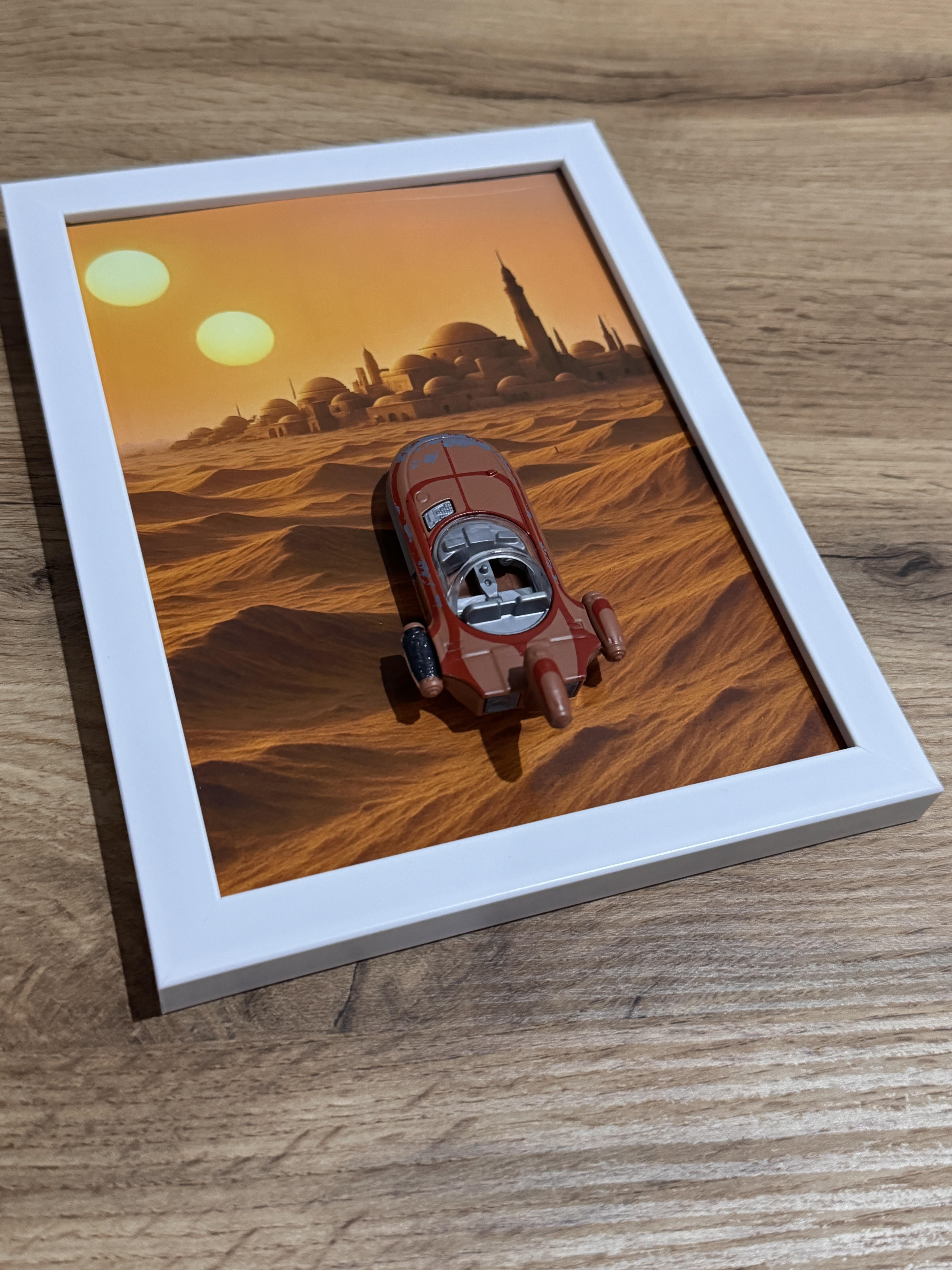 Wyjątkowa ramka kolekcjonerska inspirowana sagą Star Wars, przedstawiająca legendarną scenerię z planety Tatooine. W tle znajduje się nastrojowa grafika z charakterystycznymi dwoma słońcami oraz zabudowaniami pustynnego miasta.
