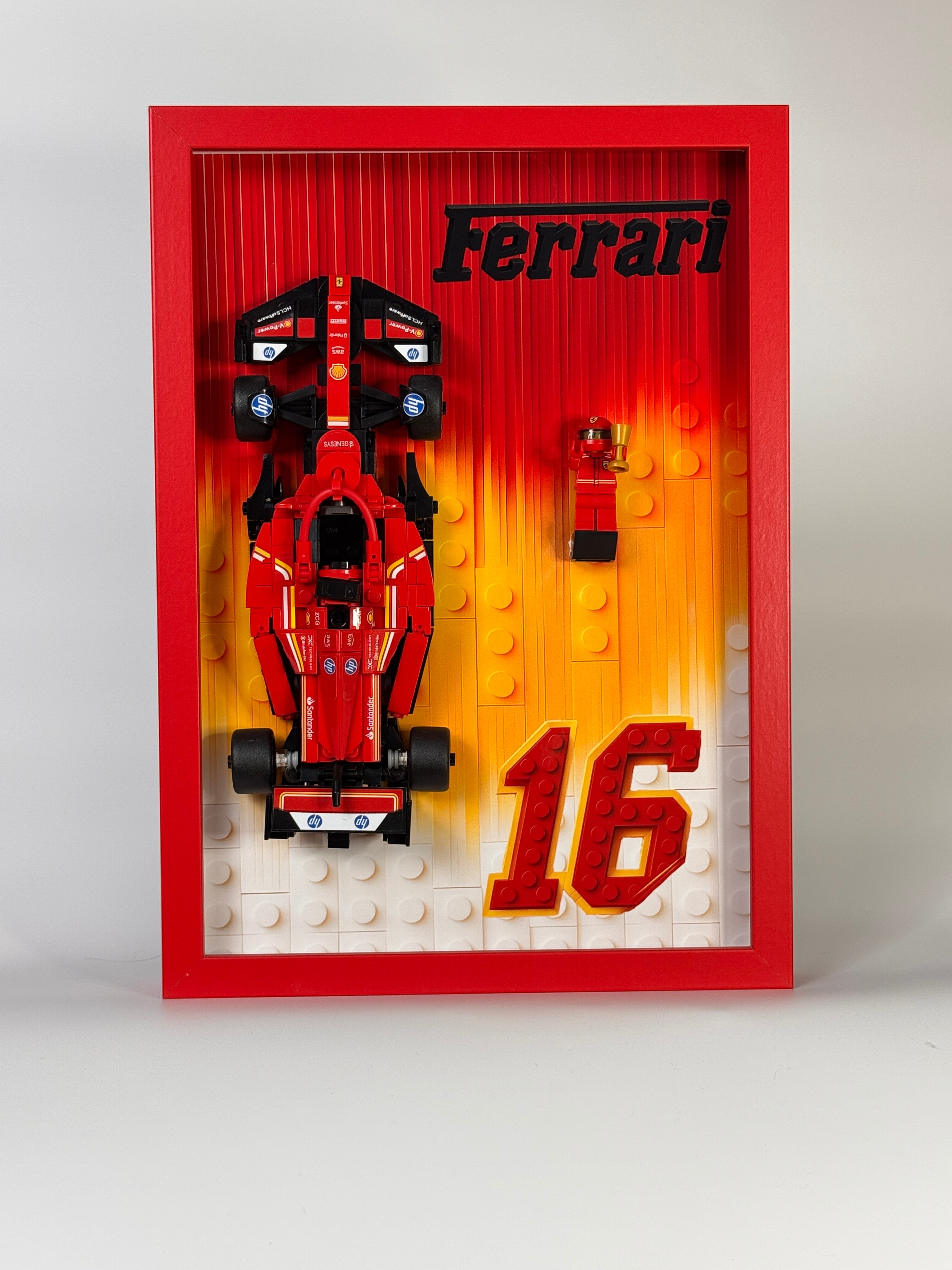 To idealna propozycja dla kolekcjonerów, pasjonatów motorsportu i osób ceniących unikatowe dekoracje łączące świat F1 z kultowymi klockami. Kompozycja jest dopracowana w każdym detalu — od cieniowania tła, po wyeksponowanie numeru 16, nawiązującego do kierowcy Scuderii Ferrari. Ramka świetnie prezentuje się w pokoju tematycznym, biurze, gaming roomie oraz w każdej kolekcjonerskiej przestrzeni.