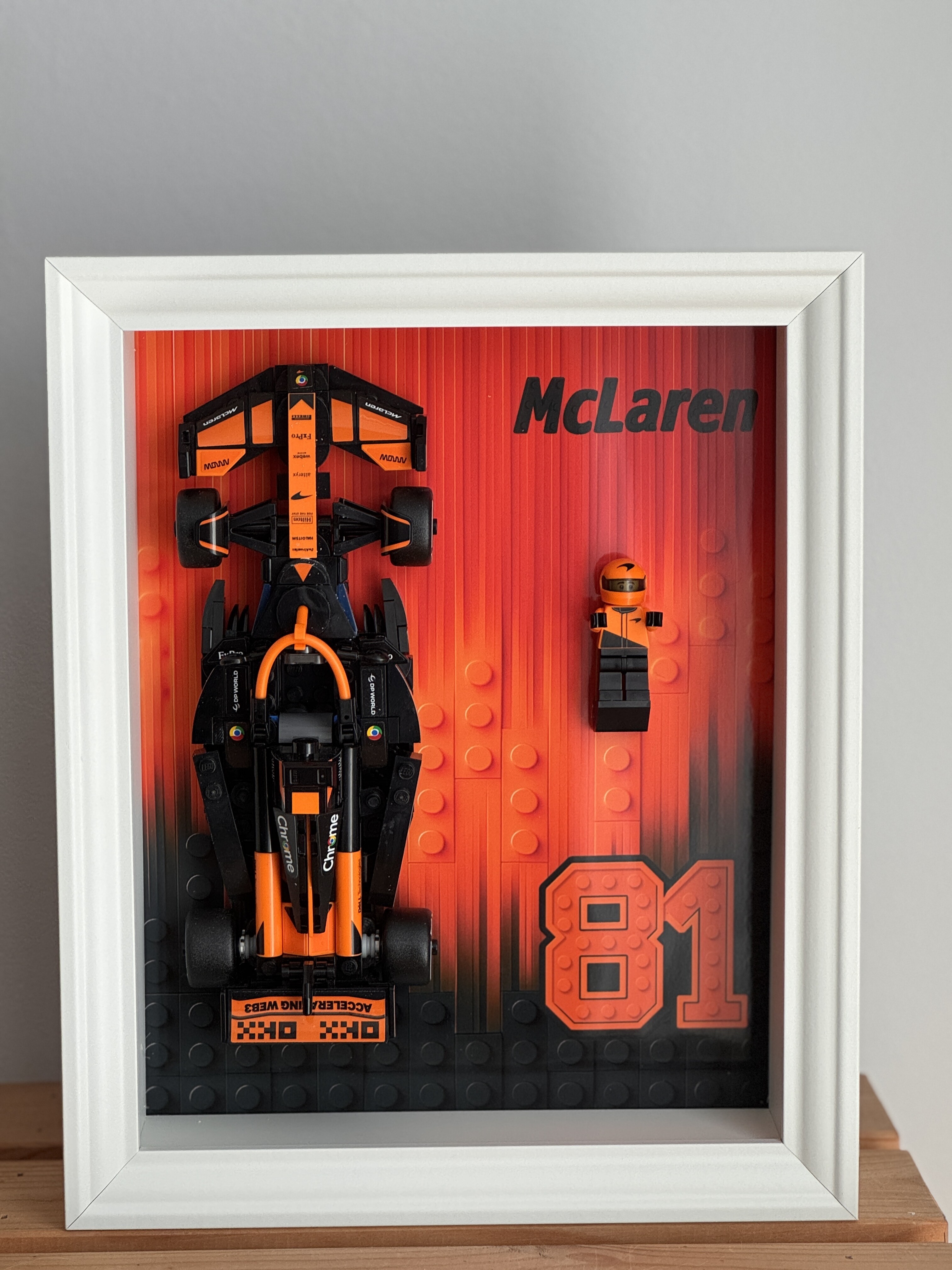 Dekoracyjna ramka w kolorze białym z tłem w barwach przechodzących z czerwieni przez pomarańcz, aż po głęboką czerń. Tło zdobione napisem „McLaren” i dużym numerem 81; sprzedawana bez zestawu LEGO, wyposażona w umocowania do samodzielnego zamocowania modelu bolidu i minifigurki.