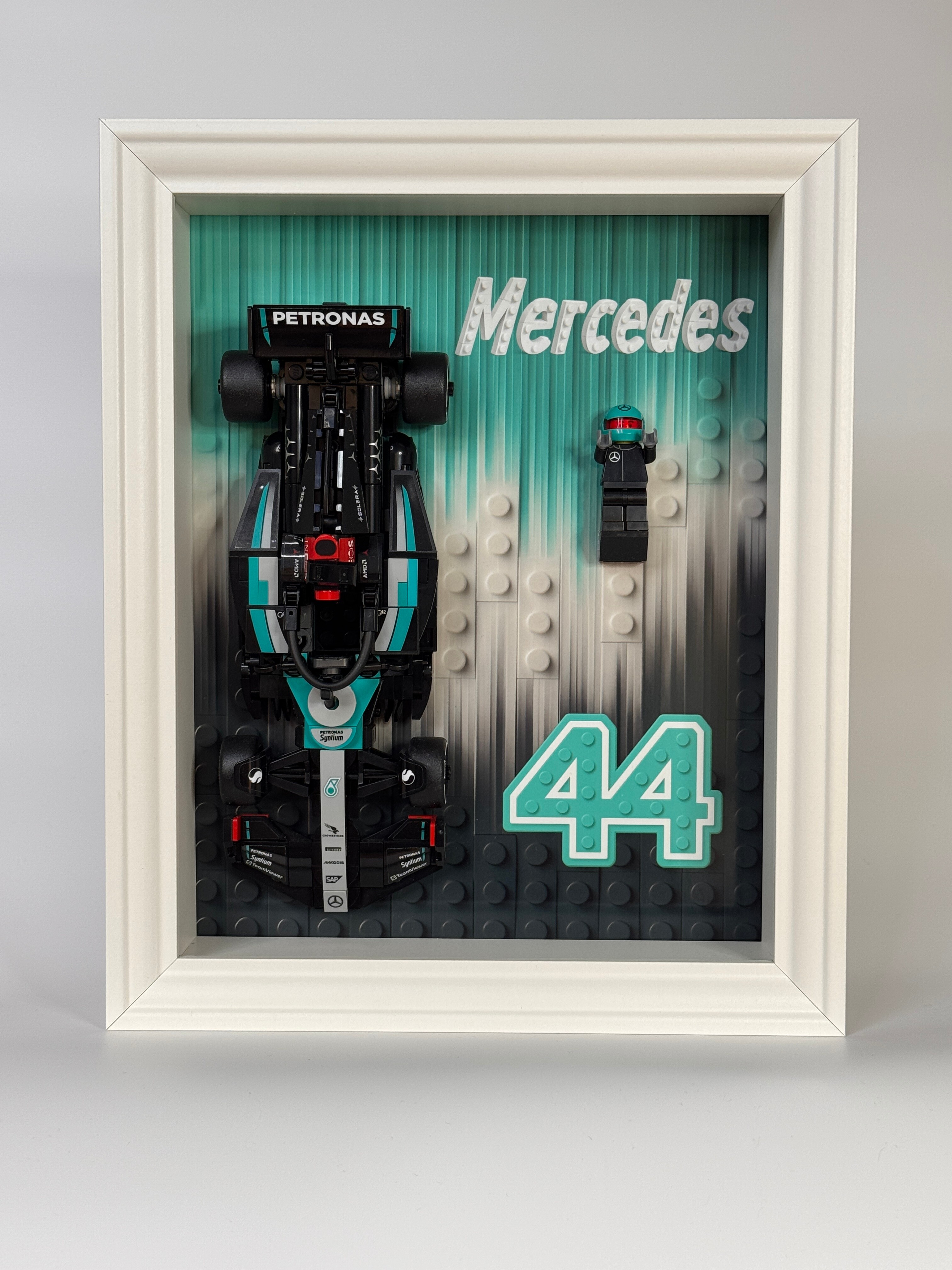 Ramka świetnie sprawdzi się w pokoju tematycznym, gaming roomie, biurze, a także wśród większej kolekcji LEGO. Starannie dopracowana kompozycja — z wyróżnionym numerem 44 oraz strukturą inspirowaną klockami LEGO — nadaje całości wyrazisty charakter. To idealny sposób, by podkreślić pasję do zespołu Mercedes F1 i wyeksponować swój model w unikalny, ekskluzywny sposób.