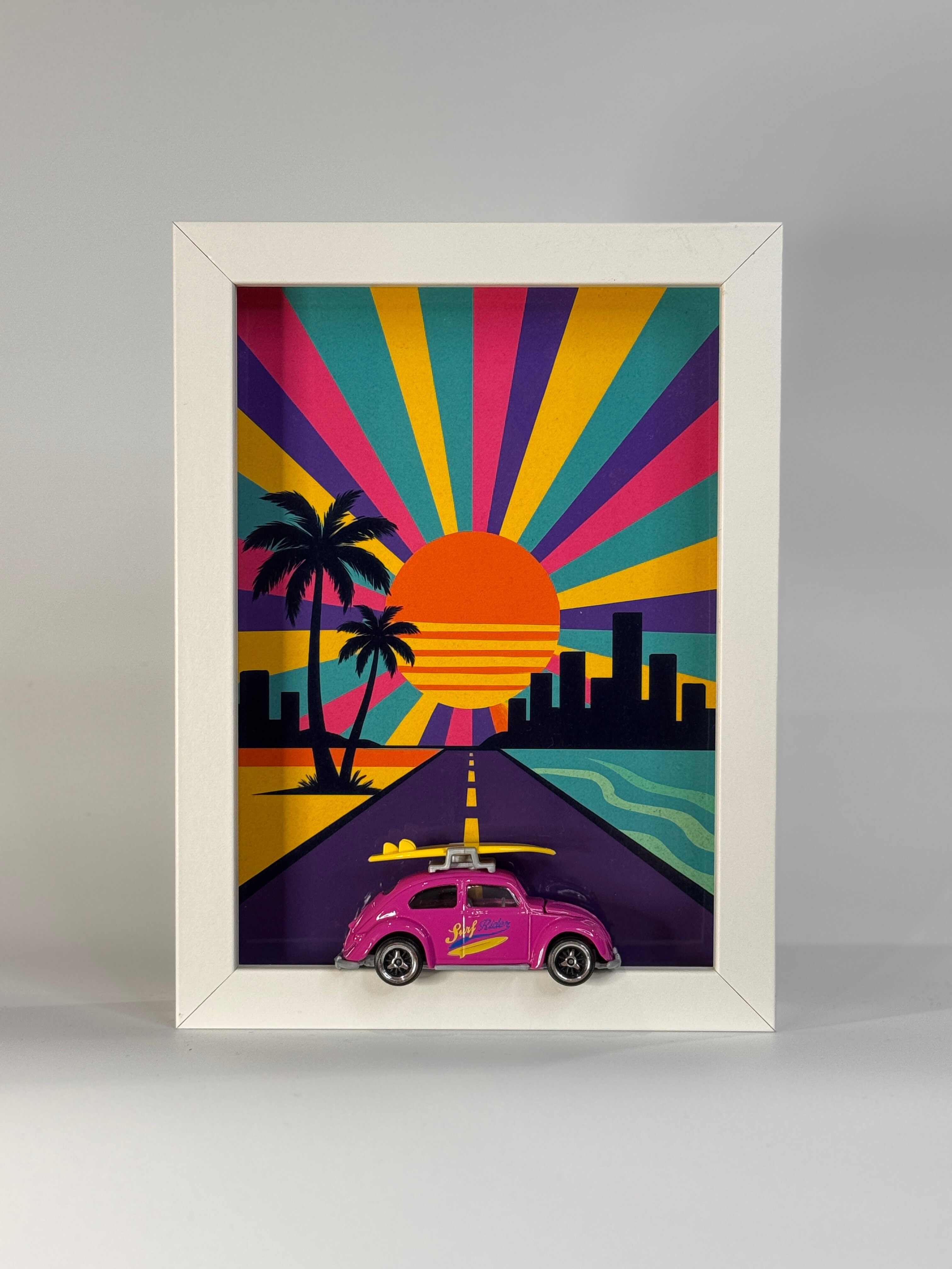 Całość zamknięta w eleganckiej, jasnej ramce prezentuje się jak małe dzieło sztuki — dynamiczne, kolorowe i pełne letniej energii. To idealny dodatek do pokoju, biura, przestrzeni kreatywnej lub prezent dla fanów modeli samochodowych, surferów oraz osób, które uwielbiają klimat lat 80. i 90. oraz styl summer vibes.
