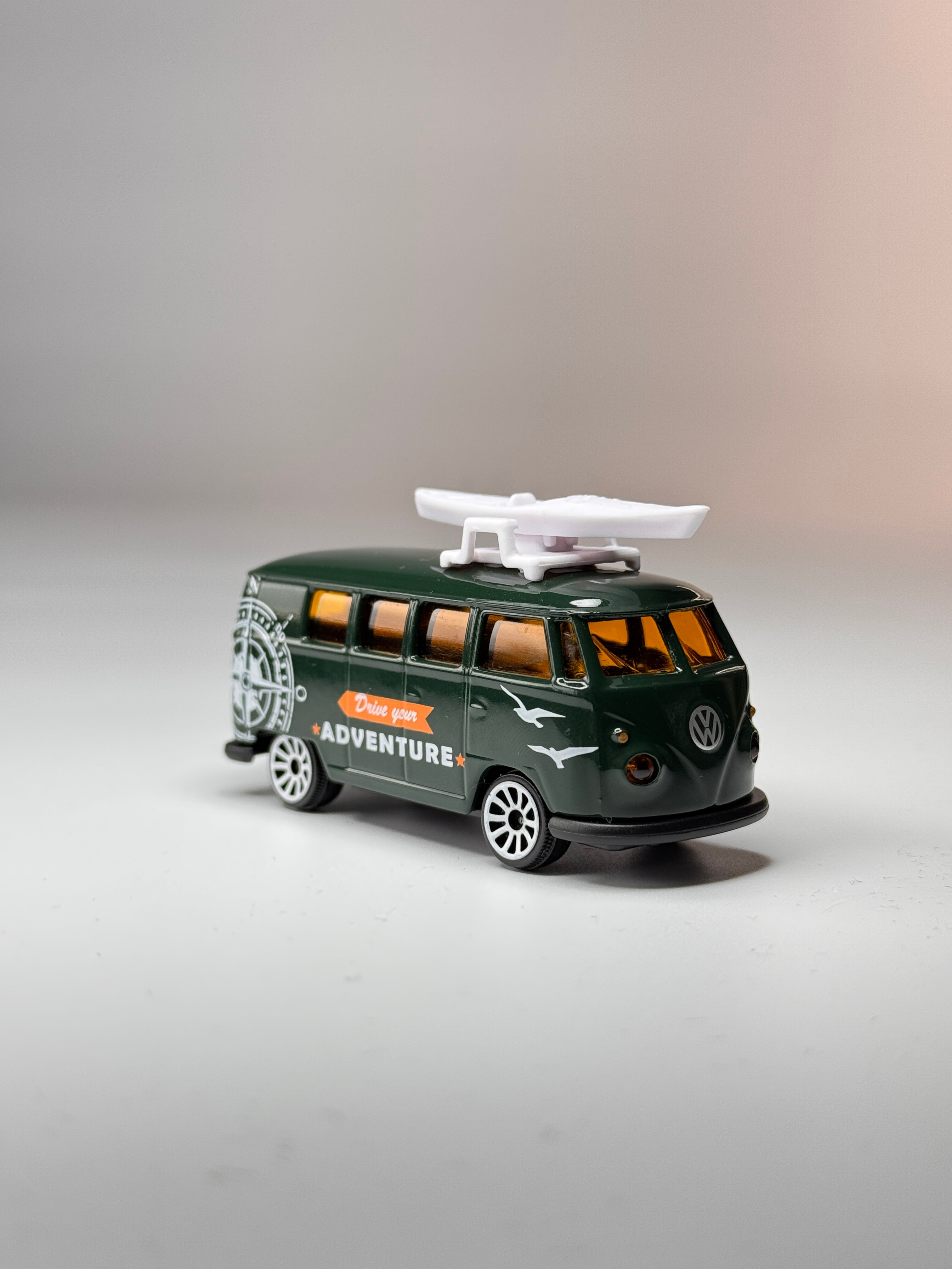Prezentujemy kolekcjonerską ramkę 3D Magnetifit z modelem Volkswagen T1 Adventure od Majorette — kultowego busa, który od dekad symbolizuje wolność, podróże i życie w rytmie przygody. Oryginalny model w głębokiej zieleni z detalami inspirowanymi outdoorowym stylem został umieszczony na tle pełnym minimalistycznych, liniowych ilustracji nawiązujących do natury: gór, fal, księżyca, słońca i biwakowania. Całość tworzy atmosferę podróżniczego klimatu i beztroski.