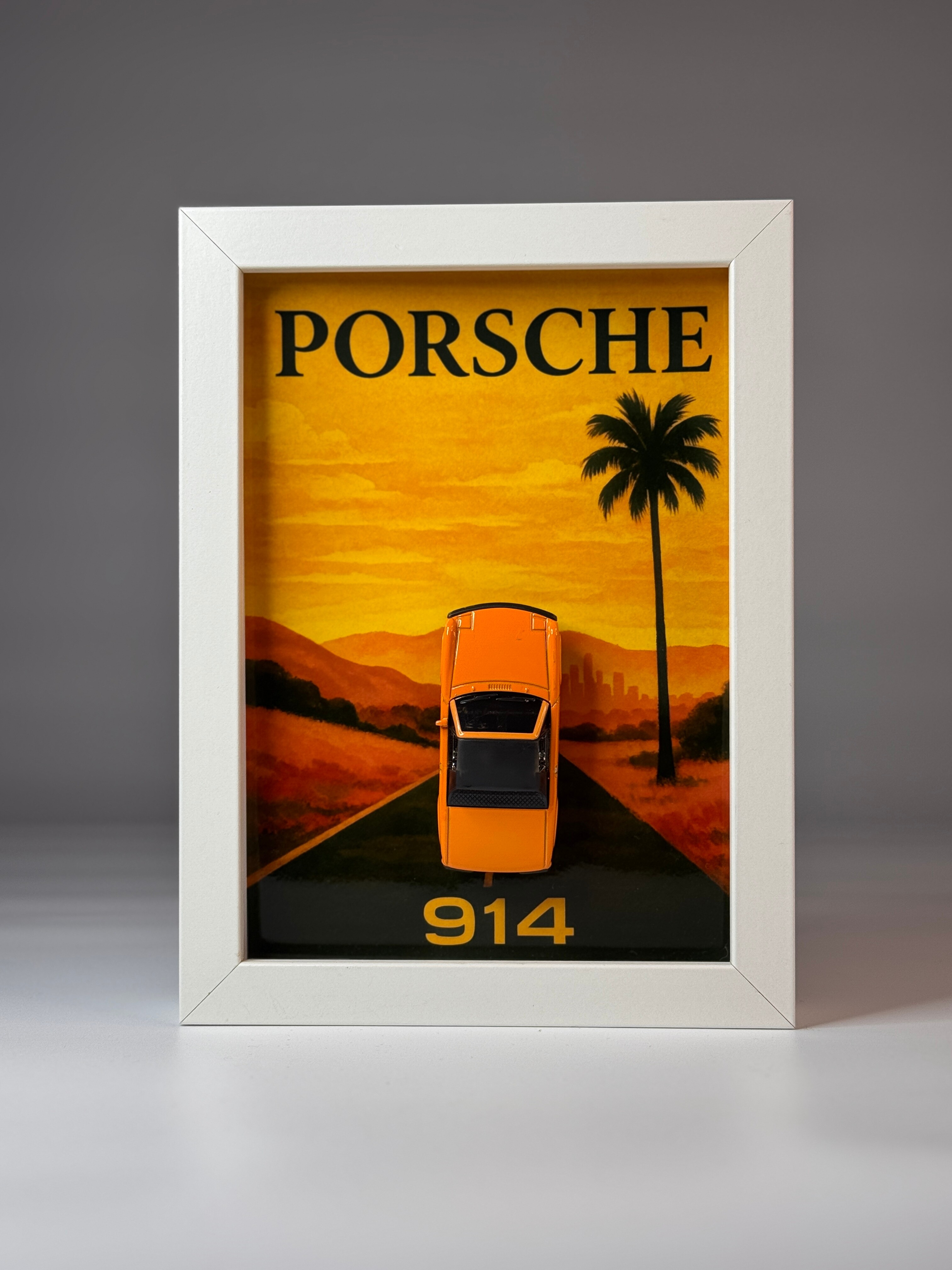 Ramka kolekcjonerska z modelem Porsche 914 to wyjątkowy sposób na zaprezentowanie ikony lat 70. – lekkiego, zwinnego roadstera, który do dziś zachwyca purystów motoryzacji. Połączenie żywych odcieni pomarańczu z klimatyczną, kalifornijską scenerią tworzy spójną, nastrojową kompozycję, podkreślającą charakter tego unikatowego projektu Porsche i Volkswagena.