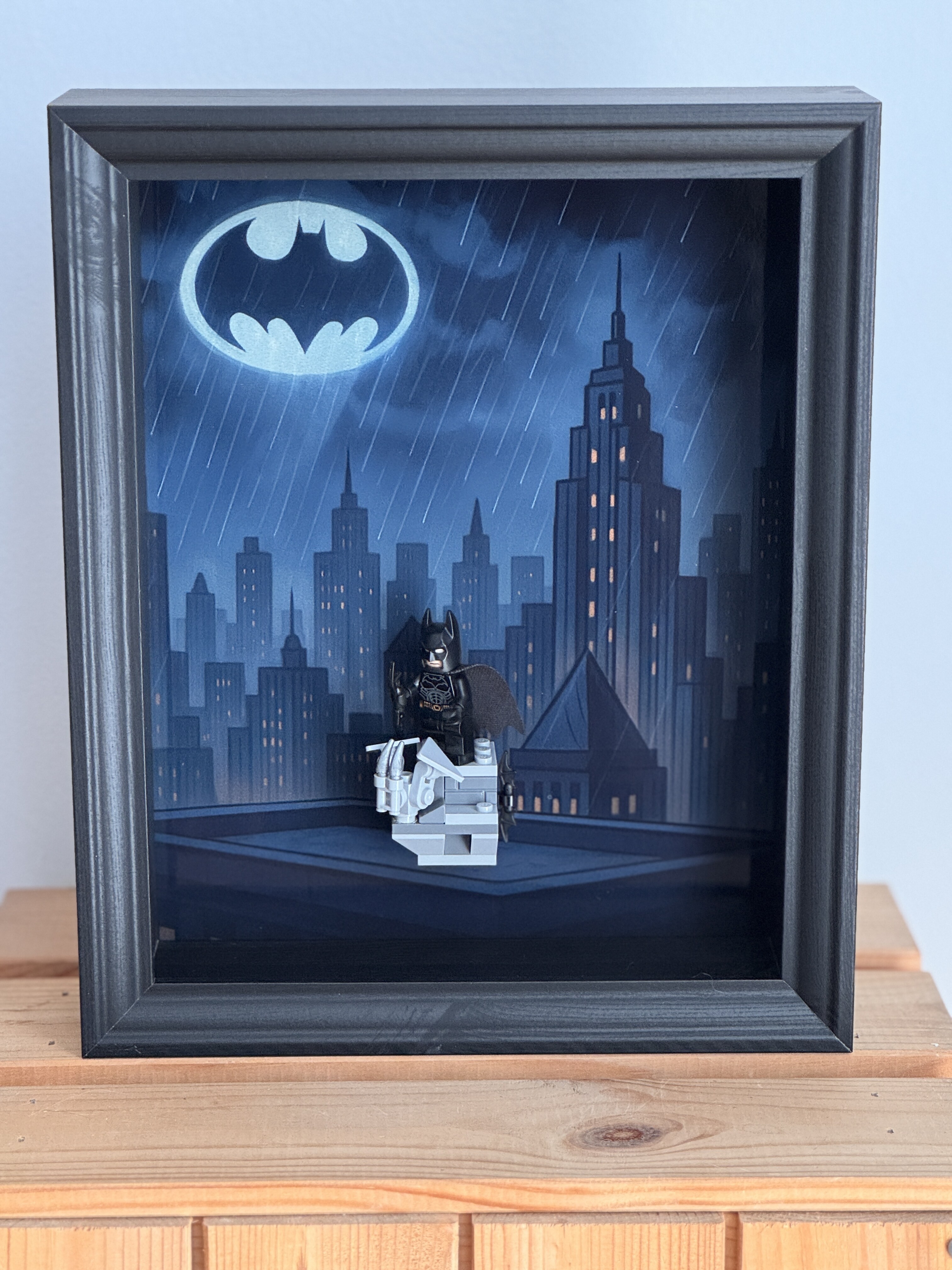 Ramka prezentowa z figurką LEGO® Batman to unikalna dekoracja, która zachwyci każdego fana superbohaterów. Wewnątrz znajduje się oryginalna minifigurka, ustawiona na tle klimatycznej grafiki, przedstawiającej nocne Gotham, rozświetlone charakterystycznym sygnałem Batmana. Całość została oprawiona w elegancką, drewnianą ramkę w kolorze czerni, co podkreśla komiksowy charakter.